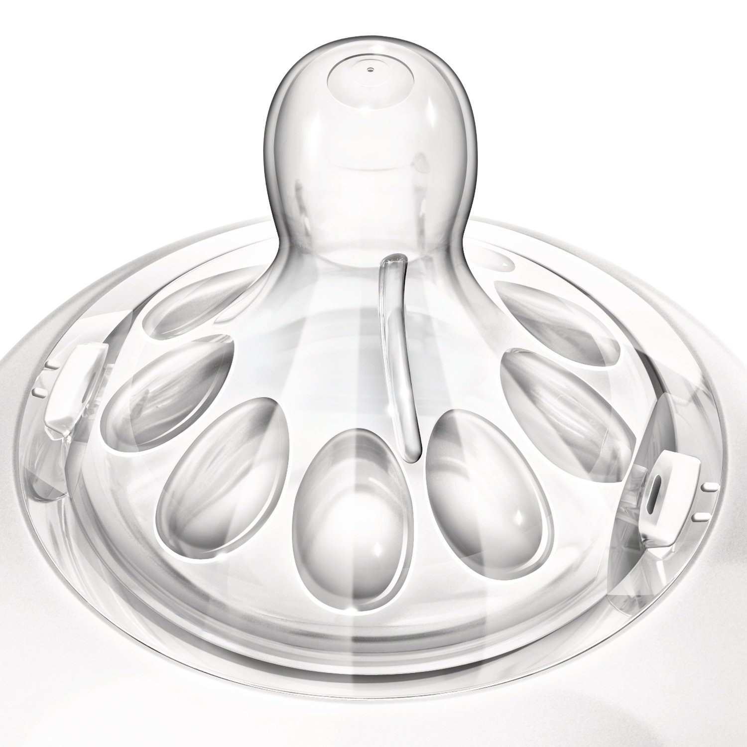 Núm vú được thiết kế hình dạng tương tự vú mẹ và có dòng chảy chậm giúp bạn có thể kết hợp việc cho bé bú mẹ với cho ăn bằng bình. Hình dáng tự nhiên của núm vú tạo độ bám vì vậy bé có thể ăn sữa thoải mái mà không bị gián đoạn. Được thiết kế theo công thức mềm mại như cánh hoa, núm vú không chỉ nhẹ nhàng với nướu của bé mà còn rất đàn hồi, không bị xẹp trong miệng bé. Hơn thế nữa, núm vú có van đôi chống sặc sữa với cơ chế đẩy khí vào bình để hạn chế khí tràn vào miệng bé gây đau bụng, ợ khó chịu.