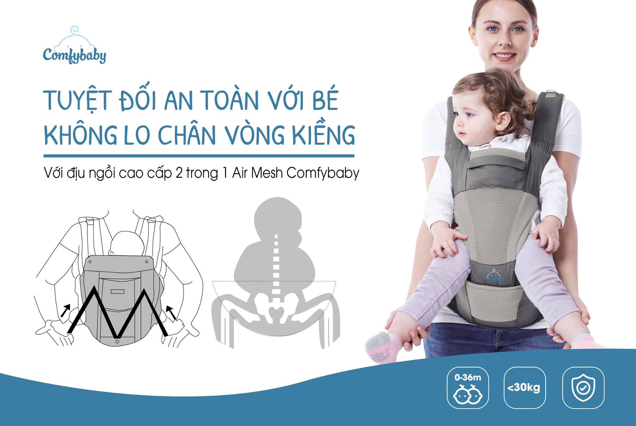 - Địu ngồi cao cấp 4 tư thế 2 trong 1 Comfybaby được làm với công nghệ Air Mesh, chất liệu có cấu trúc rỗng đảm bảo không khí có thể dễ dàng lưu thông không gây bí, khó chịu cho bé. Chất liệu này đồng thời cũng đảm bảo độ nhẹ của địu và sự êm ái thoải mái cho bé.