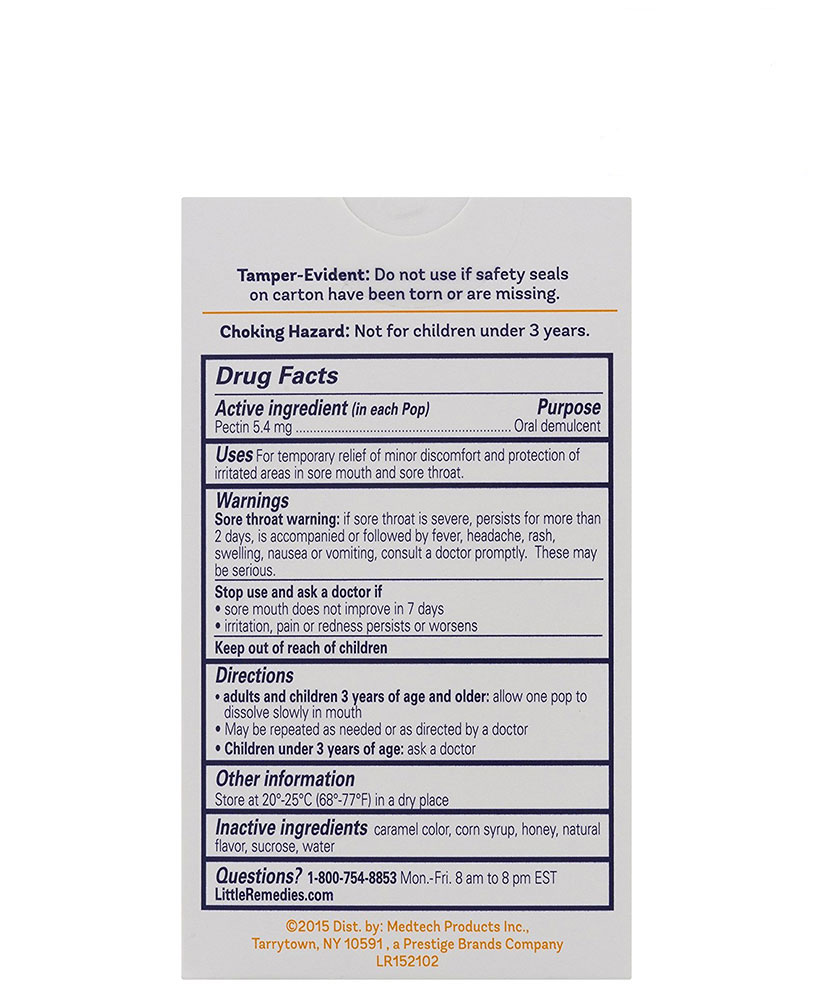 + Thành phần trong mỗi cây kẹo mút Little Remedies: Pectin 5.4mg.