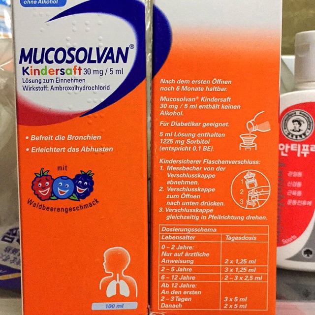 + Siro trị ho đờm Mucosolvan Kindersaft là loại thuốc ho trẻ em rất phổ biến tại Đức, sản phẩm là lựa chọn hàng đầu của nhiều bà mẹ tại quốc gia này. Và thật không khó để tìm thấy loại thuốc này trong tủ thuốc của mỗi gia đình tại Đức.