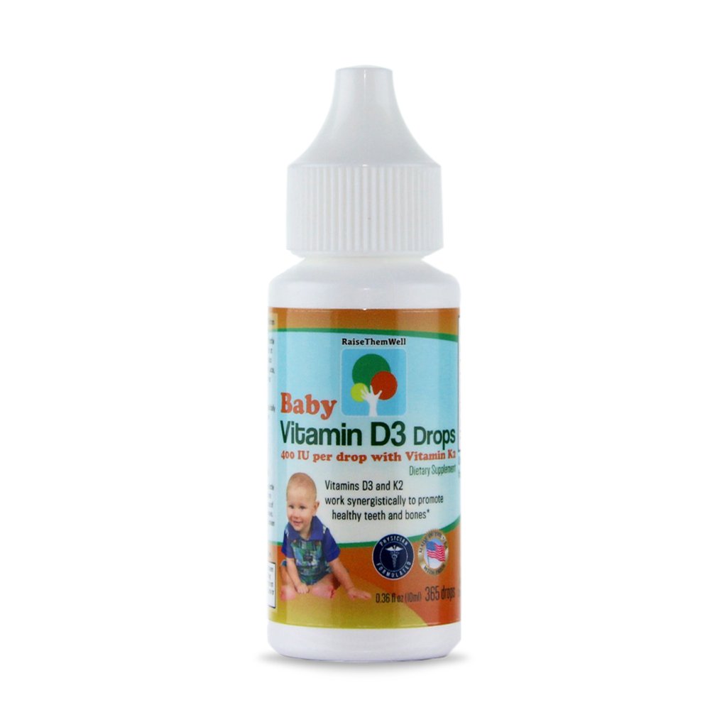 + Vitamin D3 Raise Them Well cho mỗi giọt chính xác 400 IU D3 và 10mg Vitamin K ( K2Vital ).