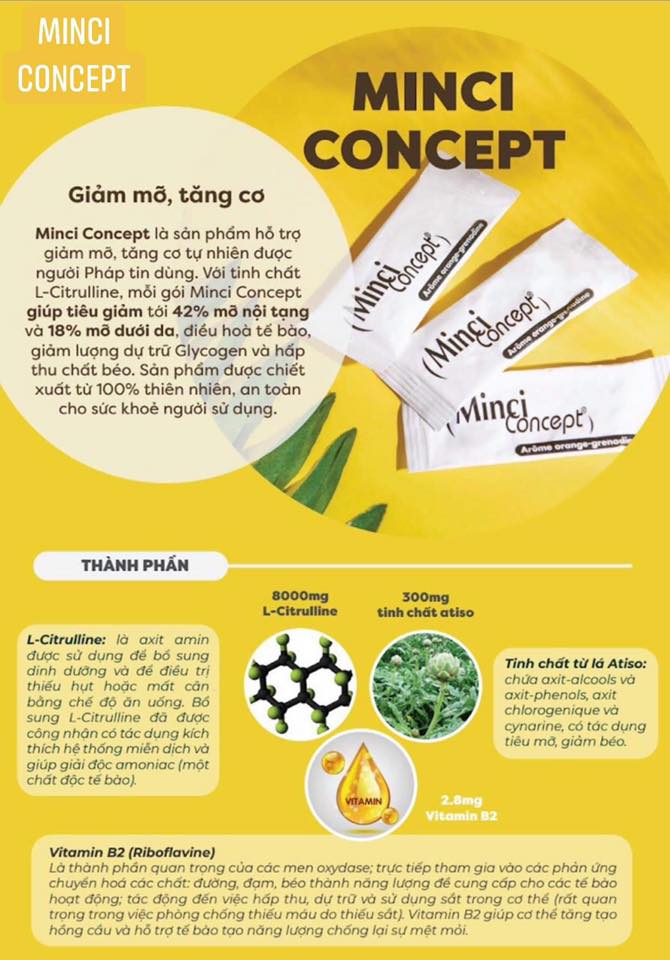 Minci Concept là thực phẩm hỗ trợ cải thiện cân nặng của Pháp. Sản phẩm được chiết xuất từ các thành phần thiên nhiên như: tinh chất Atiso, vitamin B2 hỗ trợ giảm cân mà không gây mệt mỏi, không mất nước.