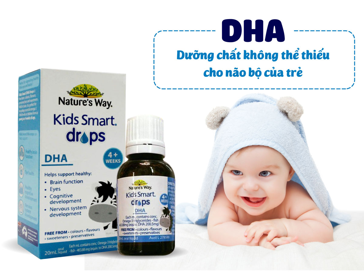 - Kids Smart DHA Drops được chiết suất từ dầu cá cao cấp và được thiết kế đặc biệt để giúp gia tăng lượng DHA omega-3 hàng ngày của con bạn ngay từ khi bé được 4 tuần tuổi.
