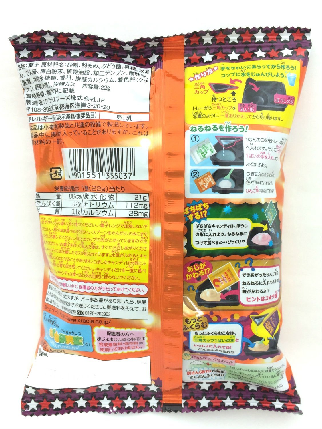 Nguyên liệu: đường, bột, glucoze, lactose, tinh bột siro, tinh bột, trứng bột trắng, dầu thực vật, tinh bột biến đổi, acidulant, baking soda, hương liệu, canxi cacbonat, màu thực vật, cacbonat dioxide.. Sản phẩm hoàn toàn từ các thành phần tự nhiên, trong đó bao gồm lúa mì.