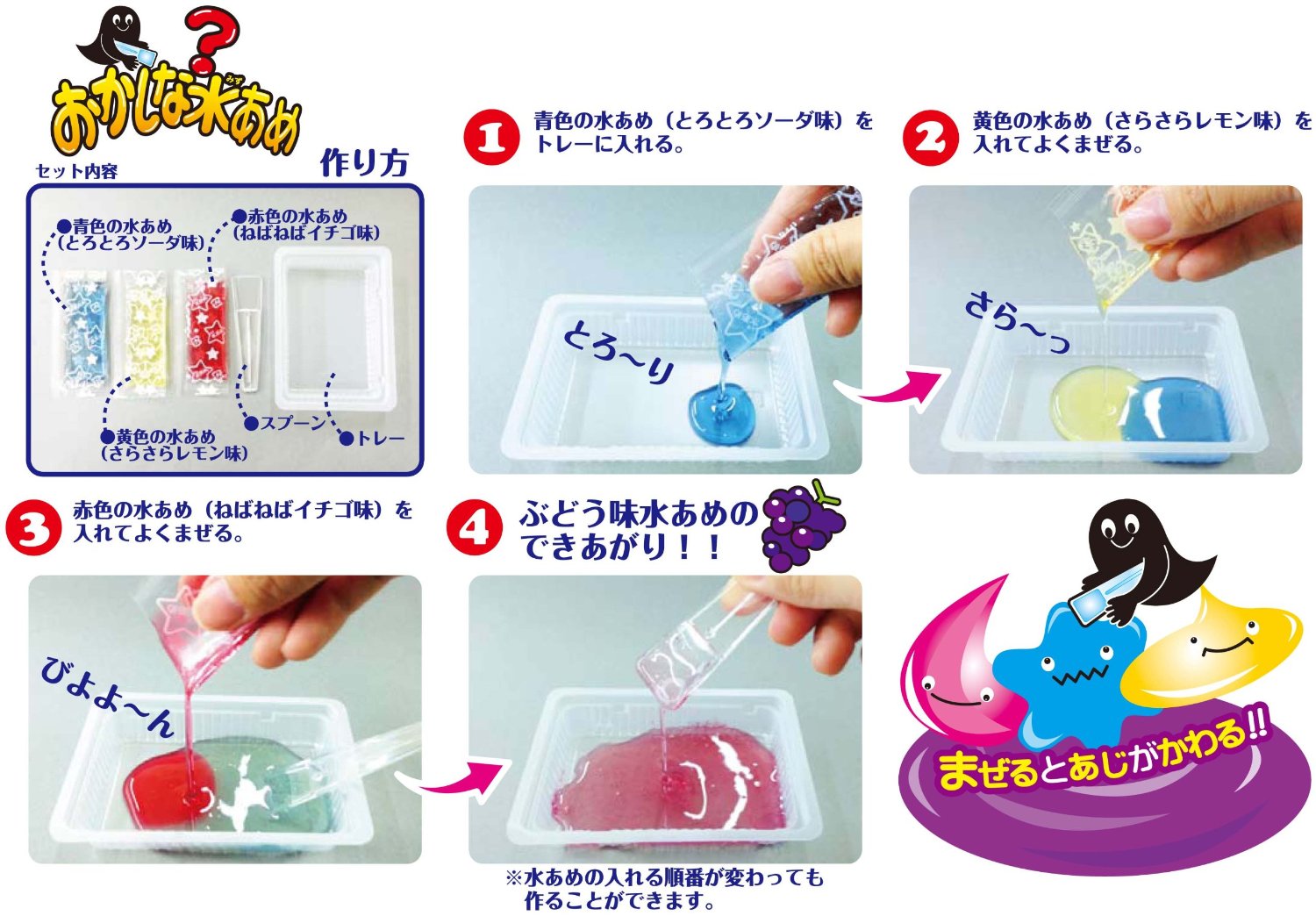 Cùng tạo nên siro mix thật lạ, thật độc từ ba vị quen thuộc dâu tây, soda, chanh leo, chắc chắn các bé sẽ rất ngạc nhiên với vị siro mới này đấy. Với siro mix Weird Starch Syrup Diy Candy, nếu như k muốn làm kẹo dẻo, các bé có thể dùng luôn hoặc thêm cùng đá bào làm món giải khát mùa hè, hoặc hòa cùng nước, thêm đá để thưởng thức ngay!