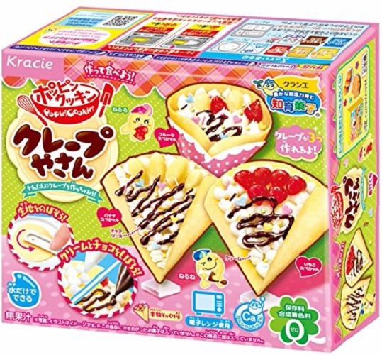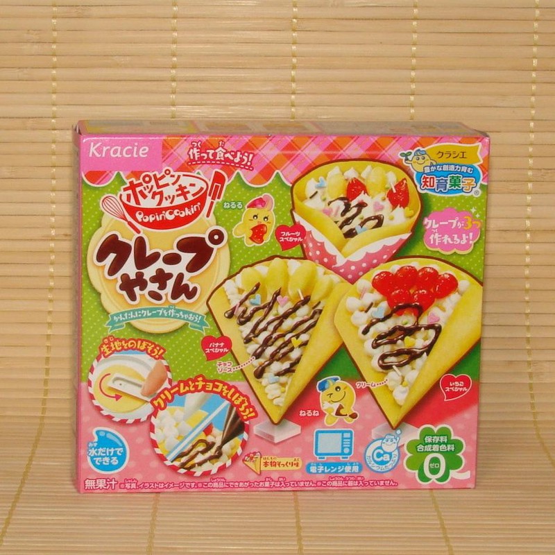 Kracie popin cookin bộ làm bánh Crepe cực vui gồm có 6 gói bột mỗi gói dùng để tạo ra những món ăn khác nhau như khoai tây, vỏ bánh, thịt kẹp, pho mát, sốt cà chua, xúc xích, bột soda, 1 gói hạt đậu trang trí, kèm theo là một khay nhựa gồm các khuôn làm bánh, một cốc để pha chế cocacola.