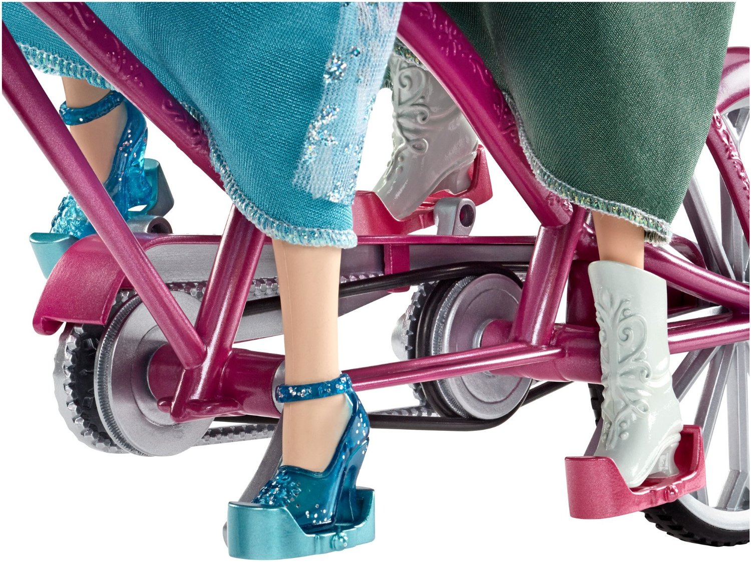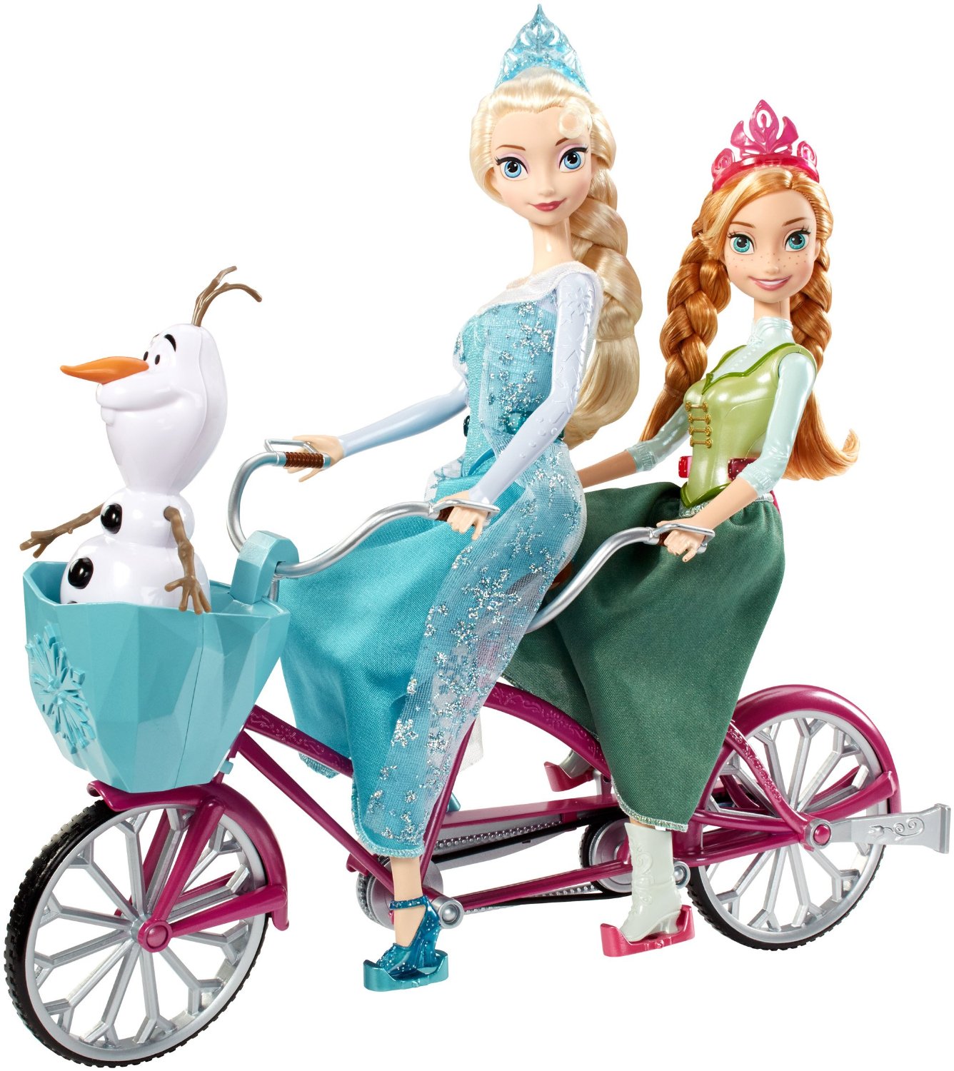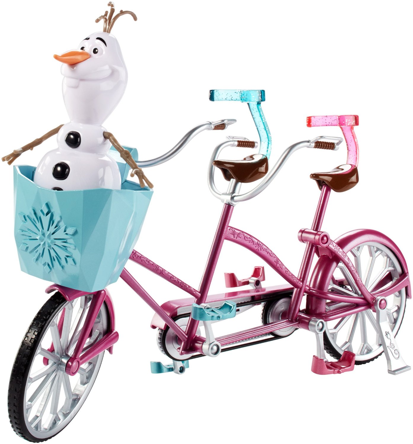 Bộ sản phẩm bao gồm: 1 xe đạp đôi màu hồng có thể di chuyển, từng chi tiết nhỏ lấy từ nguyên bản chiếc xe thật như bàn đạp, giỏ xe, yên xe, 2 nàng công chúa Elsa và Ana, người tuyết Olaf. Bộ sản phẩm được làm bằng nhựa cứng, bền màu, chắc chắn. Đặc biệt nhất, với 1 nút nhỏ phía giỏ xe, chiếc xe có thể phát ra giai điệu bài hát trong phim Frozen.