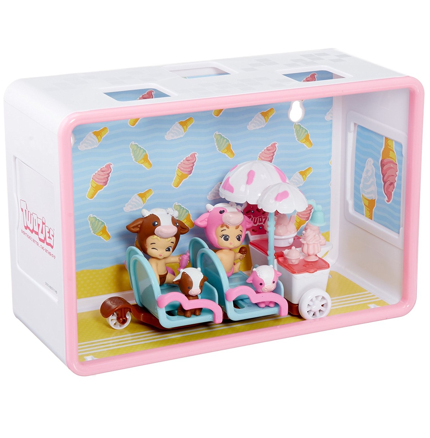 Bộ đồ chơi được đóng gói rất cẩn thận trong một chiếc hộp nhựa trắng viền hồng cánh sen. Bên ngoài có trang trí những hình ảnh Twozies vui cười bên thú cưng, và dĩ nhiên, không thể thiếu được hình ảnh món kem yêu thích của họ bên cạnh. Thông qua lớp bóng kính, ta có thể thấy được chiếc xe bên trong, hai hàng ghế đã được đánh dấu vị trí của hai Twozies. Phía trên bên trái là những chiếc kem nho nhỏ, còn phía trên bên phải là hai Twozies và hai thú cưng.
