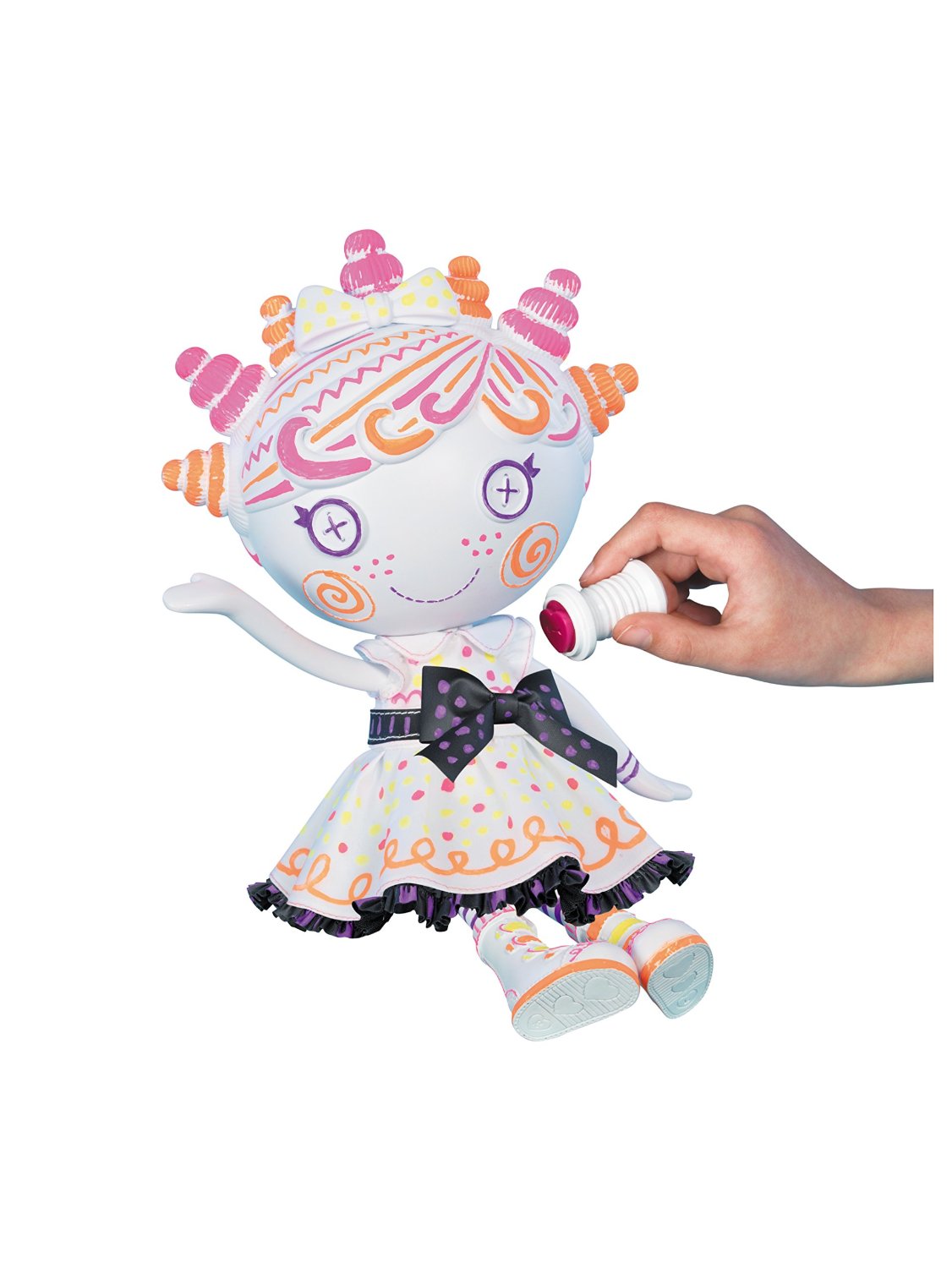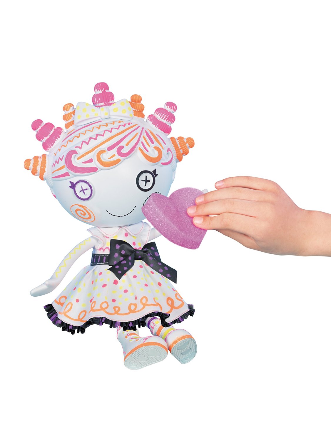 Bộ đồ chơi bao gồm 1 bé búp bê Lalaloopsy bằng đất sét cao cấp, với tóc, khuôn mặt, váy đều màu trắng, đi kèm với đó là bút màu, các bé sẽ dùng bút màu để tô lên các chi tiết sẵn có trên thân búp bê, hoặc vẽ thêm họa tiết trang trí vào váy búp bê. Thêm một thú cưng và một miếng mút xốp xóa màu.