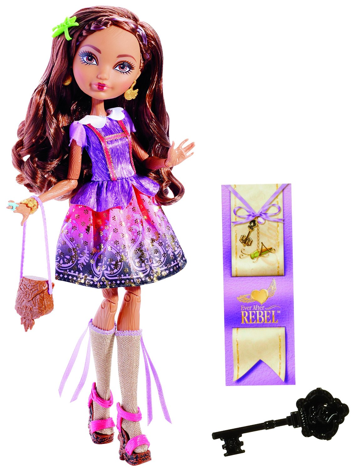 Hình ảnh công chúa được lấy nguyên mẫu từ trong câu chuyện lớn Ever After High, bộ váy lấp lánh ánh kim và mái tóc dài, bồng bềnh màu nâu đậm khiến công chúa không thể lẫn với người khác. Xắc tay xinh xắn, chìa khóa vận mệnh Ever After High, bookmark đi kèm chứa thông tin và cuộc sống của công chúa, hãy cùng khám phá nha các bé!