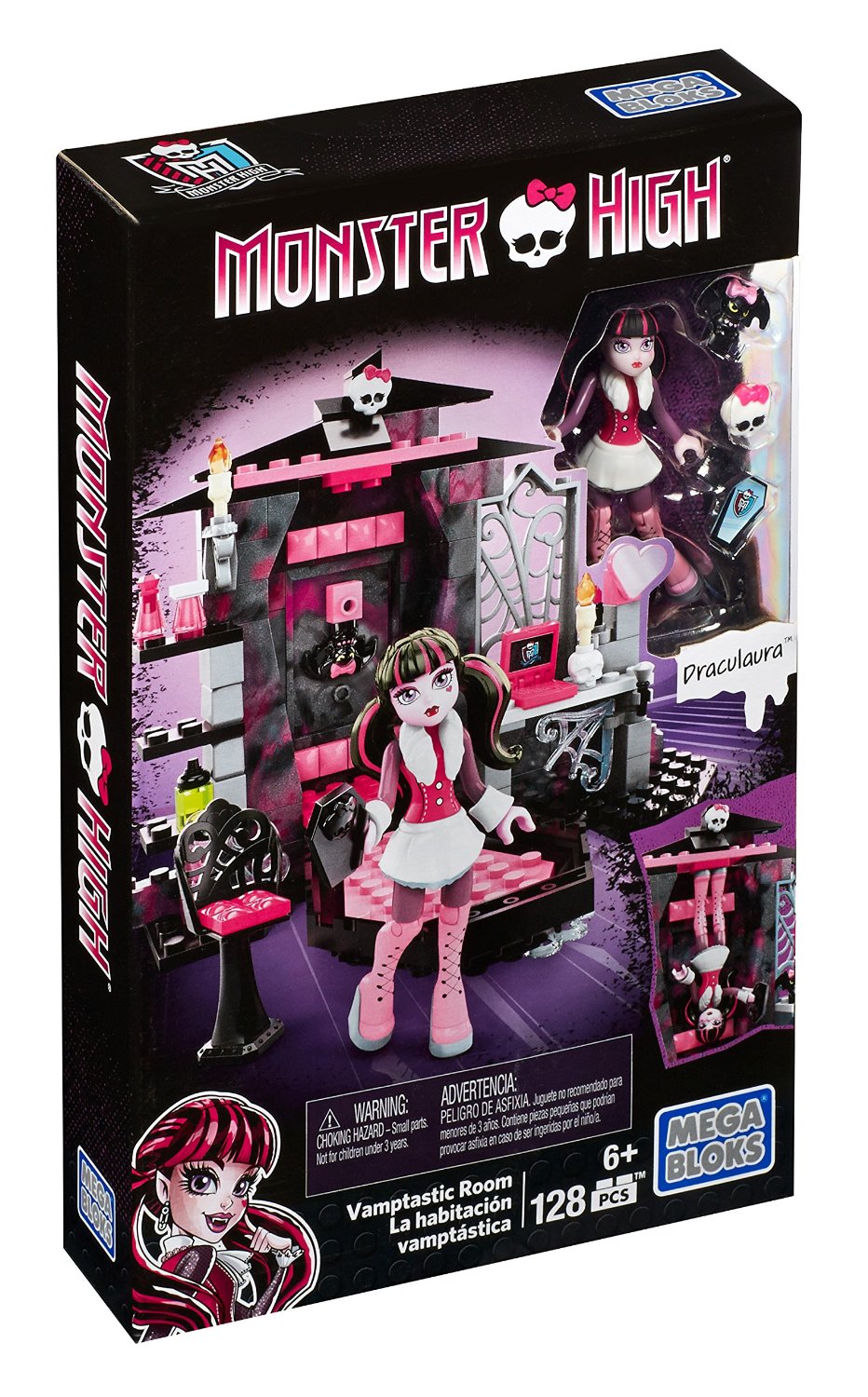 Phòng ngủ cẩm thạch của công chúa quái vật Mega Bloks Monster High Draculaura's Vamptastic Room Building lấy nguyên mẫu từ phòng ngủ trong phim hoạt hình Trường Học Quái Vật, từ giường tới tủ đồ đều làm giống như những chiếc quan tài. Sản phẩm có 1 búp bê công chúa quái vật, và giường ngủ liền tủ tường dễ dàng tháo lắp theo các khớp tròn lego.