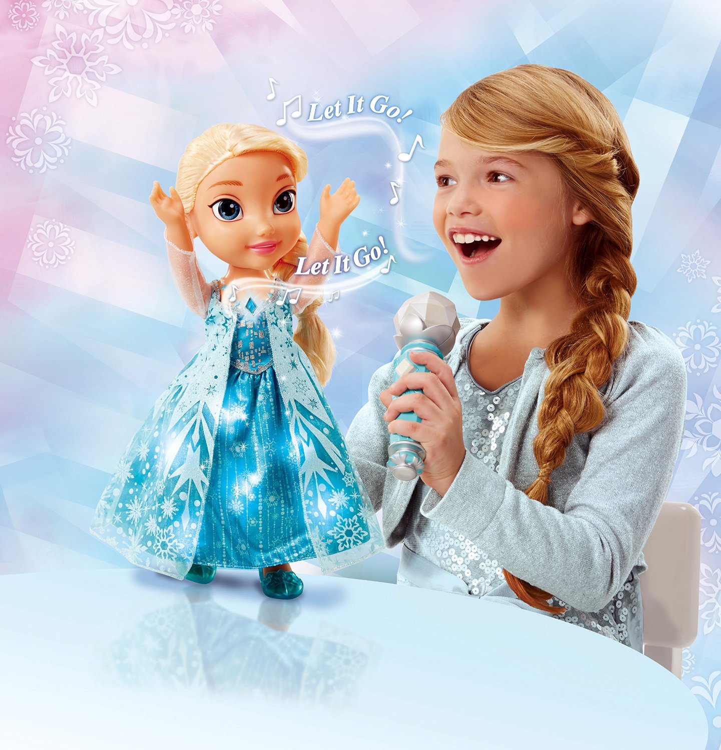 Nữ hoàng băng giá Elsa mặc chiếc váy ánh sáng lung linh, sợi dây chuyền lấp lánh ánh sáng, chân đi hài – tất cả đều được lấy nguyên mẫu trong phim hoạt hình Frozen.Ngoài khả năng song ca, Frozen Sing-A-Long Elsa Doll còn là bộ sản phẩm rất thích hợp cho việc học ngoại ngữ của bé khi sản phẩm có thể nói hơn 15 cụm từ kì diệu bằng tiếng Anh và tiếng Tây Ban Nha – ngôn ngữ phổ thông thứ 2 thế giới!