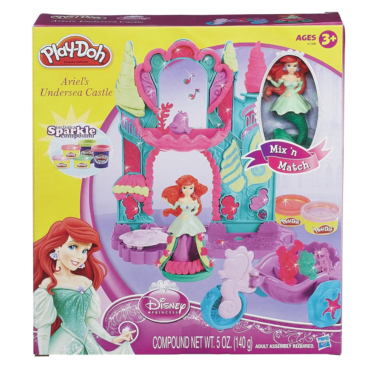 Bộ bột nặn Play-Doh Disney Princess Ariel's Undersea Castle Playset cung cấp cho bé tất cả những dụng cụ cần thiết để có thể tạo ra một thế giới xinh đẹp cho nàng tiên cá, bé sẽ trang trí lâu đài cho nàng tiên cá , che dấu chiếc đuôi cá giúp nàng bằng một bộ váy thật lộng lẫy. Bộ đồ chơi bao gồm một khung lâu đài bào gồm các chi tiết khuôn hình trang trí in sẵn trên bề mặt, một phần đế lắp lâu đài bao gồm 1 chiếc vỏ sò có chữa sẵn khuôn để tạo ra hai người bạn thân thiết là chú cá bống Flounder và quản gia cua Sebastian, 1 chiếc xe cá ngựa 3 bánh có thể lăn, đặc biệt trên bánh còn in các khuôn tạo hình trang trí như ngôi sao, hoa, nhạc…., một dao cắt, một máy đùn, 2 lon chất Play-Doh Plus màu xanh và hồng, 3 lon Play-Doh Sparkle Compound lóng lánh màu xanh, đỏ, hồng. Bạn cũng có thể bổ sung cho bé các thêm nhiều màu sắc hơn nữa bằng các lon bột nặn Play Doh khác.