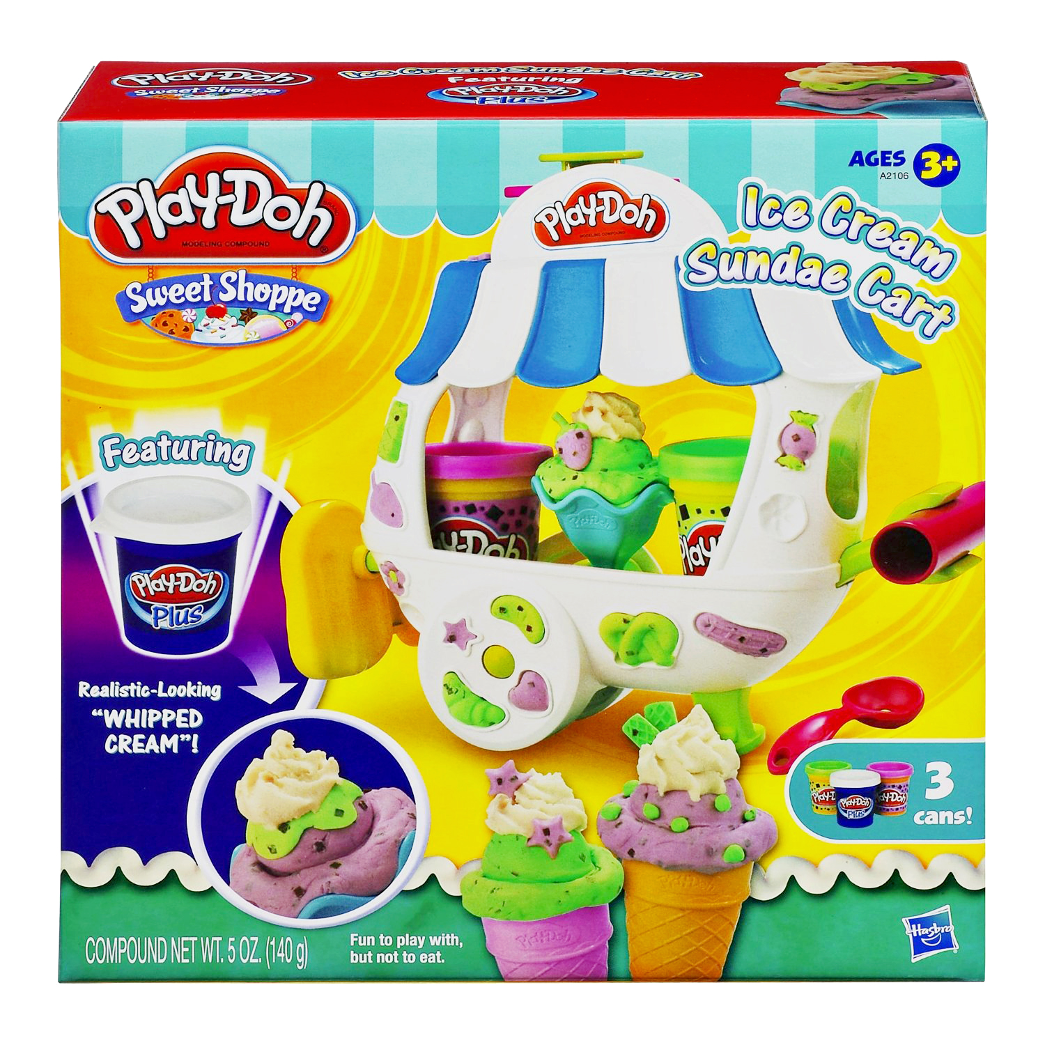 Play-Doh Sweet Shoppe Ice Cream Sundae Cart cung cấp một bộ dụng cụ giúp bé làm ra những cây kem trông cực kì chuyên nghiệp và đẹp mắt. Bộ sản phẩm bao gồm 3 hộp bột nặn, một nhà xe chứa kem trên đó có in hình các khuân trang trí, các dụng cụ giúp bé làm kem cây, kem ly, ốc quế và máy phun kem tươi. Với những chiếc kem ốc quế và kem ly, có sẵn một chiếc thìa nhựa giúp bé tạo độ tròn cho những viên kem đầy màu sắc, sau đó xếp chúng vào ly và ốc quế, dùng máy phun kem phủ một lớp lên mặt. Tạo các hình hoa, quả trái tim, các con vật để trang trí cho chiếc kem thêm hấp dẫn. Để làm những chiếc kem que bé chọn màu sắc, cho lần lượt 2 phần bột vào khuân, đặt thêm chiếc que có sẵn trong bộ kẹp giữa, ép chặt khuân lại và bé đã có một chiếc kem que rất giống y như thật. Sau khi hoàn thành, bé sẽ trưng bày chúng ở nhà kem di động như những nhà kem hấp dẫn mà bé vẫn hay thấy chúng ngoài đường phố. Với bộ sản phẩm này, sẽ đem đến cho bé những trải nghiệm thật thú vị.