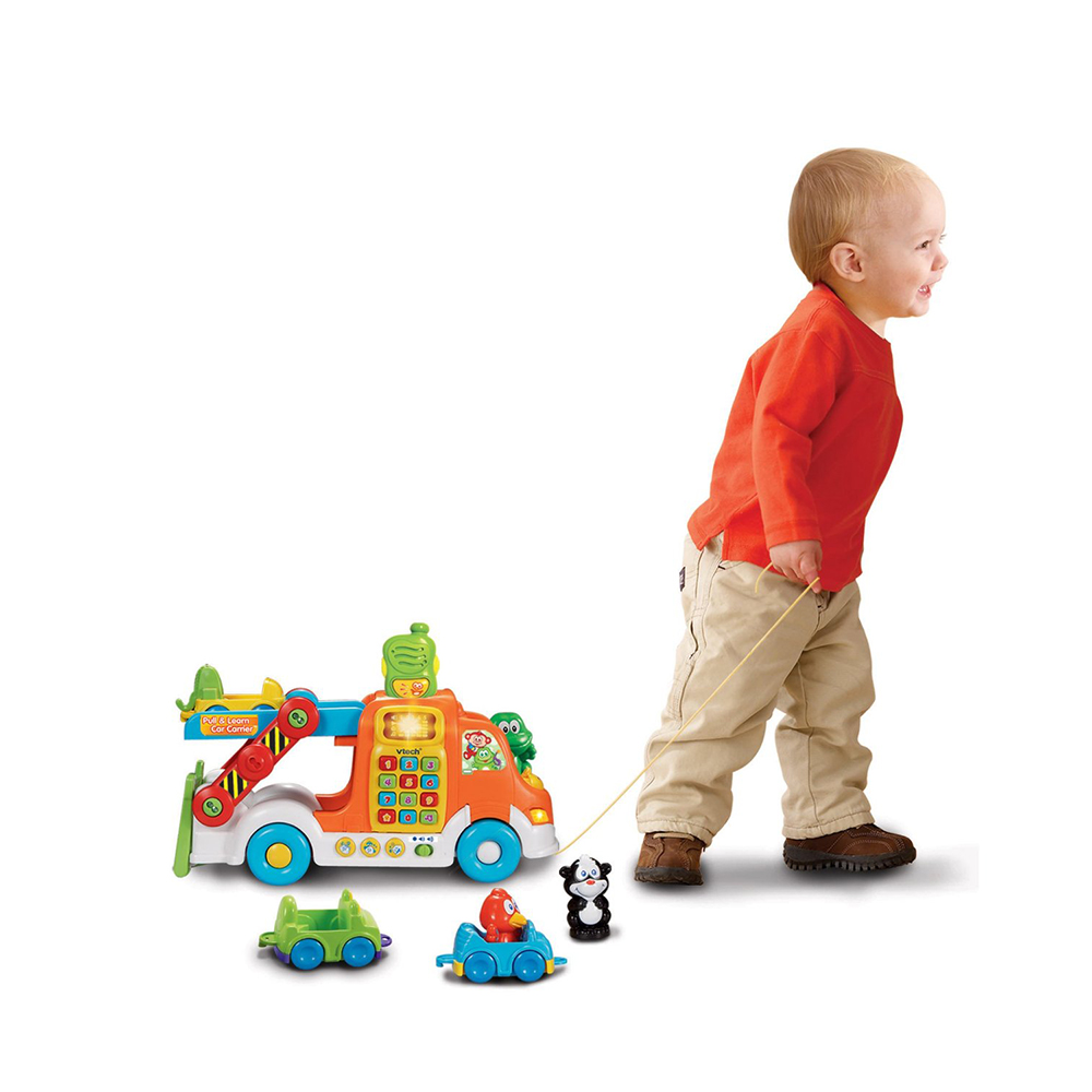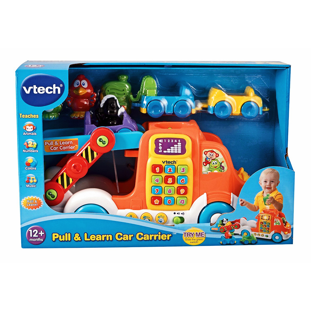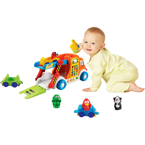Bộ đồ chơi xe cứu hộ Vtech dành cho bé từ 12 tháng tuổi trở lên. Sản phẩm bao gồm 1 xe lớn, 3 xe nhỏ và 3 nhân vật dễ thương là bạn chim, cún và ếch. Mỗi nhân vật sẽ sở hữu 1 chiếc xe nhỏ, các bạn đang lưu thông trên đường thì xe gặp trục trặc và phải gọi cứu hộ. Trên xe cứu hộ lớn có các nút bấm với số từ 1 đến 9, các nút hình con vật tượng trưng cho 3 nhân vật trên, nút nhạc, nút còi. Bé có thể nhấn vào các nút này để nghe phát âm các con số, tiếng chuông, tên các con vật và những cụm từ liên quan đến lái xe thú vị. Mỗi nhân vật có 1 chiếc xe riêng cho mình do đó trò chơi đòi hỏi bé phải tìm cho đúng chủ nhân cho chúng. Đằng sau xe lớn có bộ cảm biến, khi bé cho các xe đi qua bộ cảm biến này sẽ nhận diện các loại xe và phát ra âm thanh tương ứng. Bé yêu của bạn sẽ vô cùng thích thú khi chỉ cần nhấn các nút ngộ nghĩnh có sẵn trên xe là có thể nghe rất nhiều các loại âm thanh phương tiện, cách phát âm các cụm từ, bài hát và các giai điệu thú vị.
