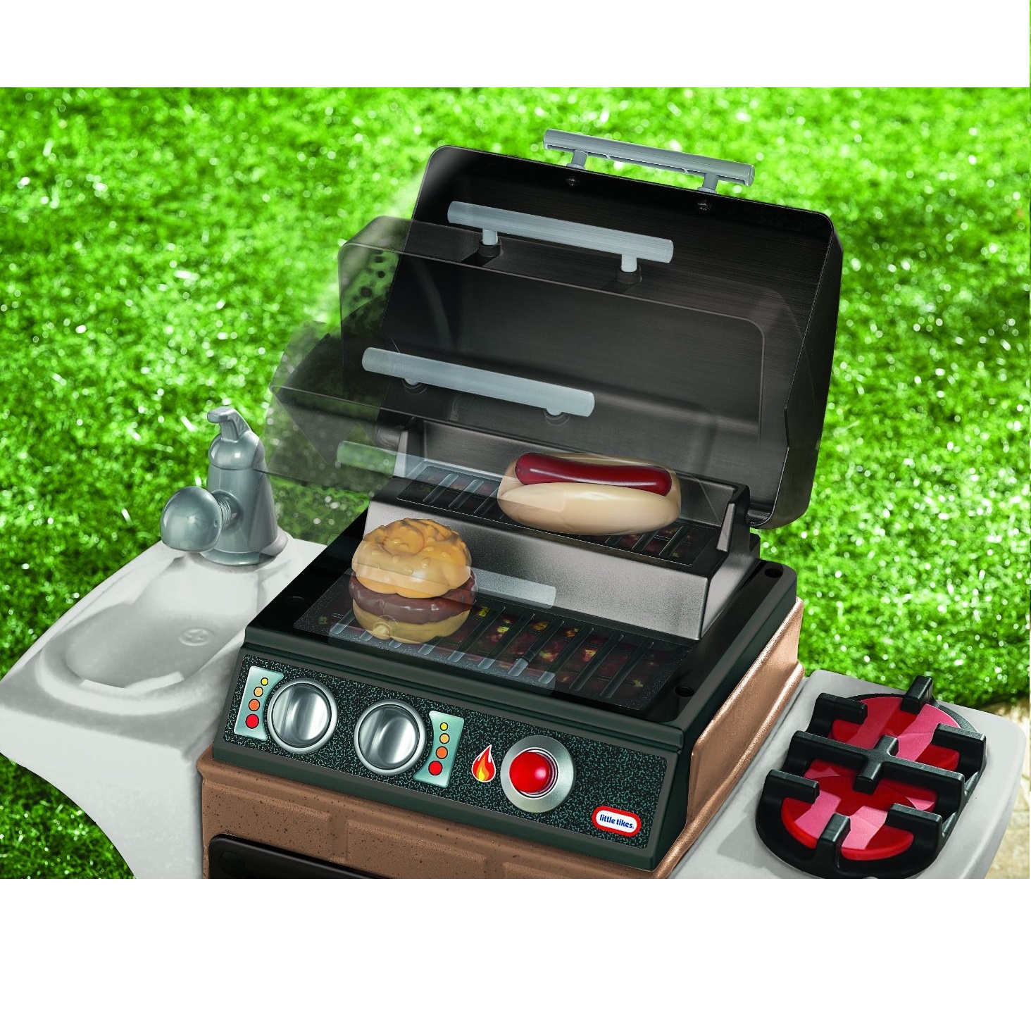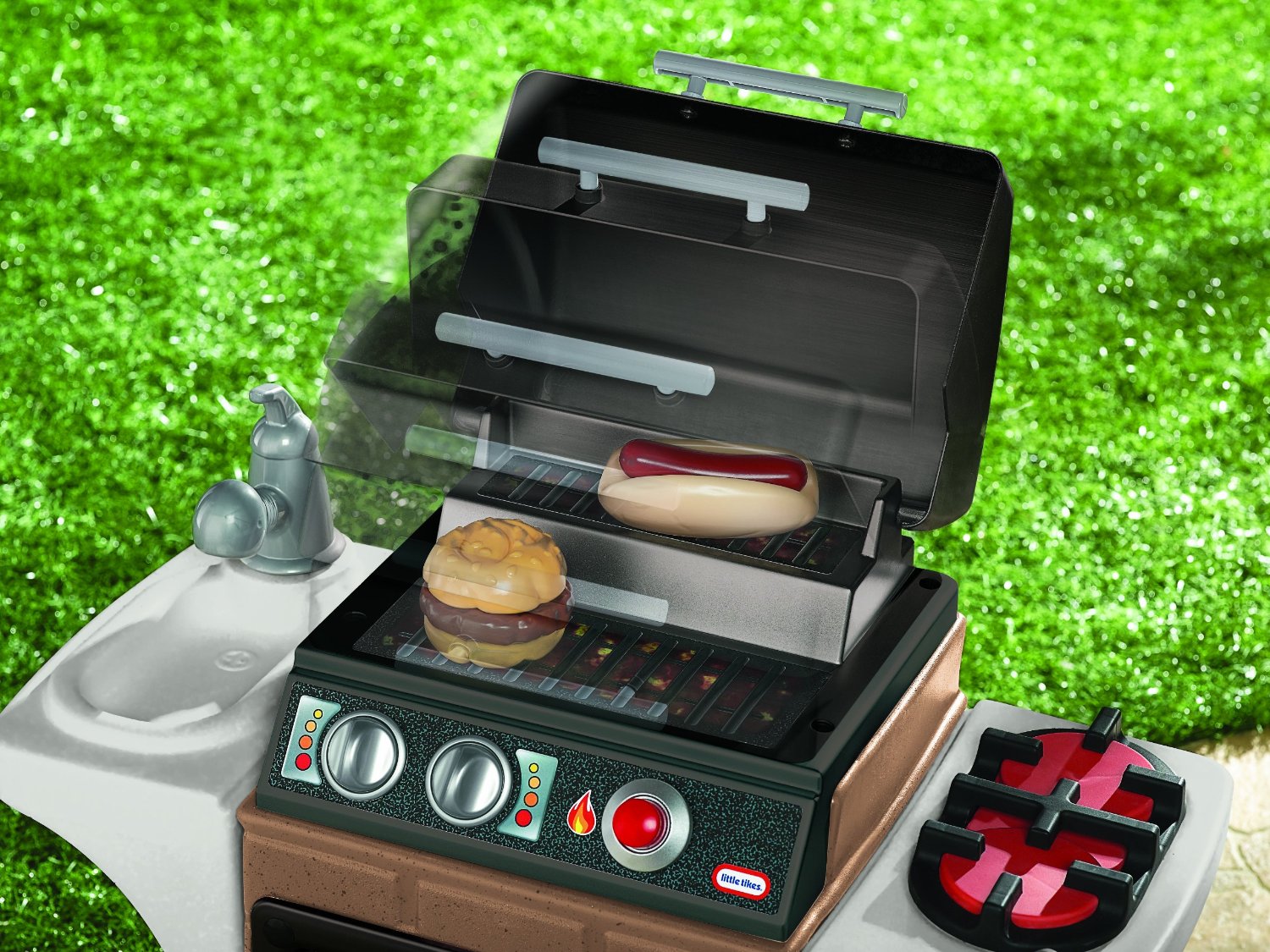 Bộ bếp nướng Get Out 'n' Grill là sản phẩm của hãng Little Tikes được thiết kế dành riêng cho trẻ trong giai đoạn từ 2 – 5 tuổi nhằm phát triển kĩ năng và tư duy của bé trong lứa tuổi này. Bộ bếp được thiết kế cực kì sang trọng với 3 tông màu chủ đạo nâu, trắng đen được phối hợp hài hòa, đẹp mắt. Bé sẽ là chủ nhân của như một khu bếp tiện nghi và hiện đại bao gồm: lò nướng kép, tủ đựng dụng cụ, bồn rửa mặt. Ngoài ra, bộ sản phẩm còn đi kèm tám dụng cụ cần thiết cho một bữa tiệc ngoài trời như thìa, dĩa, các loại bánh, xúc xích, nước sốt cà chua...