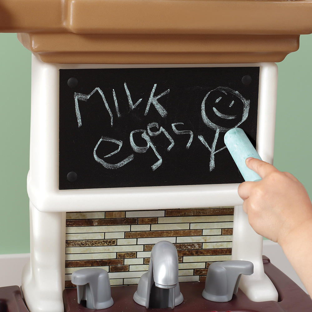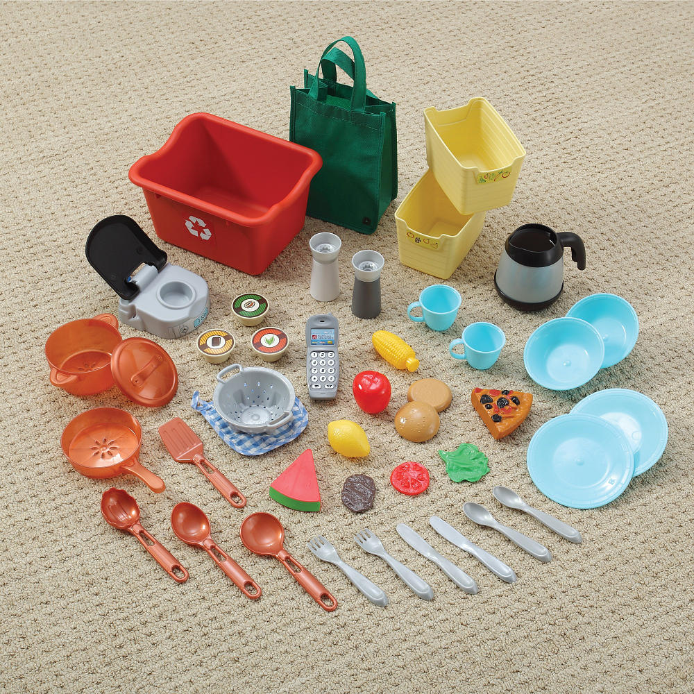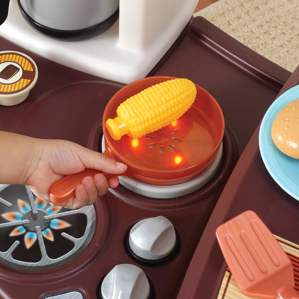 Với bộ đồ nấu bếp bằng nhựa Gourmet Kitchen, bé yêu nhà bạn sẽ như được sở hữu cả một không gian bếp trong nhà với đầy đủ các dụng cụ được sắp xếp một các cực kì khoa học và hợp lí như chính trong bếp nhà bạn. Nhiều tính năng tuyệt vời được tích hợp trong một bộ sản phẩm với kích thước nhỏ gọn, bao gồm lò vi sóng, khu vực nướng, lò nướng thông thường, bếp nấu ăn, rổ đựng, một điện thoại, dụng cụ nấu ăn: xong, chảo, thìa, dĩa. Tất cả đều được sắp xếp trên một giá nhiều tầng một cách cực kì hợp lí, tiện dụng cho bé khi chơi. Giá được thiết kế để gắn với tường trong phòng của bé. Tầng trên cùng của giá là nơi đặt lò vi sóng, móc treo thìa, muôi, giở chứa thìa, đũa. Tầng 2 là bếp ga. Tầng 3 là một tủ để đồ, móc treo nồi, xong. Tầng dưới cùng là một giỏ đề đồ lớn và một không gian để bé có thể chứa những dụng cụ khi chơi. Chắc chắn bé yêu nhà bạn sẽ vô cùng thích thú khi được sở hữu món quà tuyệt vời này. Tất cả những dụng cụ, đặc biệt là với nồi xong, chảo đều có những hình món ăn minh họa sinh động trong đó, giúp bé phát huy trí tưởng tượng của mình. Với Gourmet Kitchen, bé sẽ có cảm giác mình như là một đầu bếp thực thụ đang chế biến những món ăn cực kì hấp dẫn.