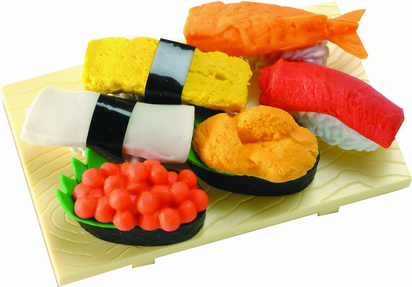 Nằm trong dòng “eraser making kit” - Bộ tẩy hình Sushi ers được đánh giá là một trong những bộ sản phẩm đồ chơi đất năn được yêu thích nhất. Lấy cảm hững từ món sushi, sushi là món ăn truyền thống của Nhật Bản và đã trở nên phổ biến ở rất nhiều nước trên thế giới với rất nhiều loại sushi từ cá, trứng, củ quả…Bộ tẩy bao gồm tất cả những công cụ đầy đủ và cần thiết để hỗ trợ bé một cách tốt nhất trong quá trình nặn và làm những cục tẩy như: 1 sách hướng dẫn bằng tiếng Nhật và hình vẽ, thêm nữa có kèm các mảnh ghép cắt ra để làm nhãn bao ngoài ly nước và bìa giấy giả rong biể và làm hộp đựng sushi,, 01 hộp nặn bao gồm 4 viên với 4 màu: Nâu, xanh da trời, vàng; 01 hộp giấy với chất liệu đặc biệt có thể đựng nước, 01 khay với 2 mảnh ghép trong đó thiết kế khuân hình dạng các loại: cá, trứng cá hồi, rau củ, cơm sushi.