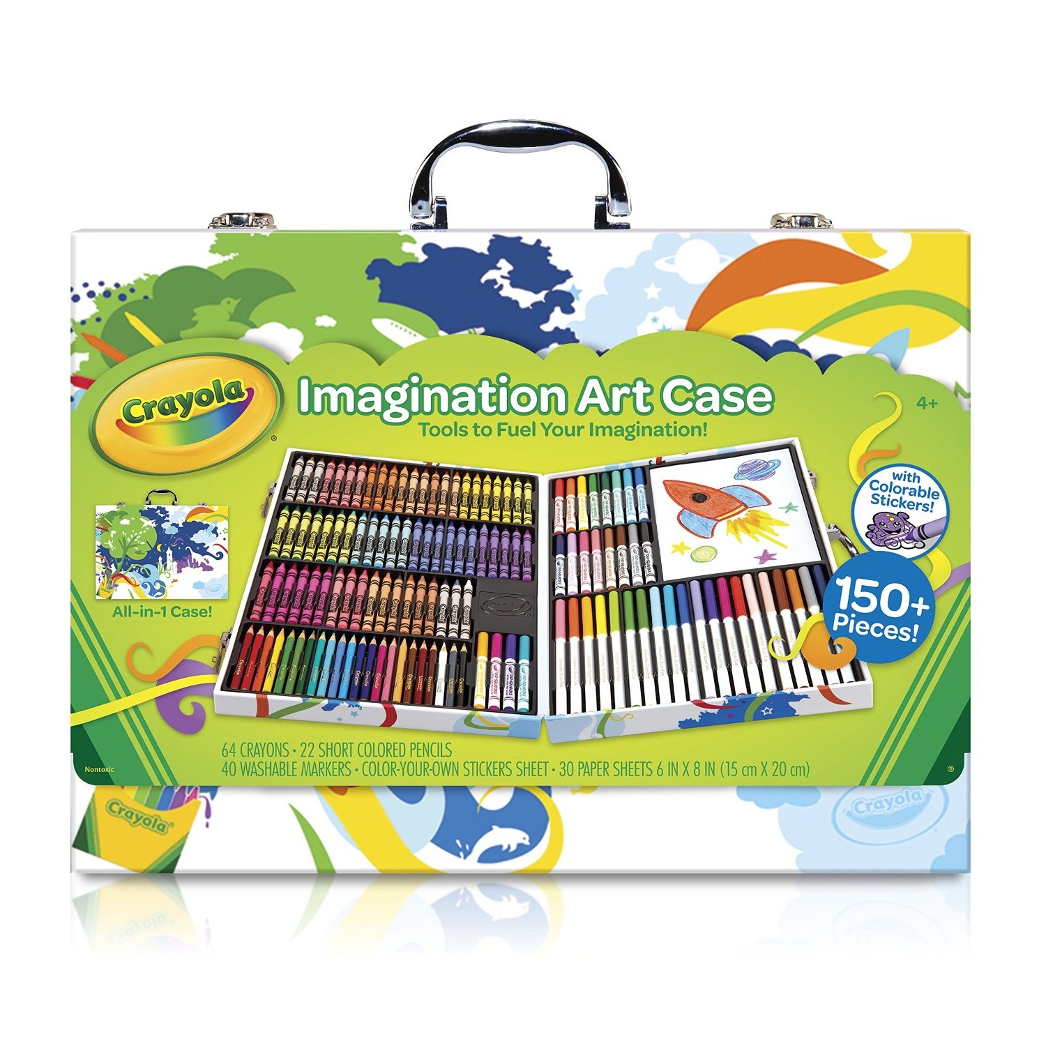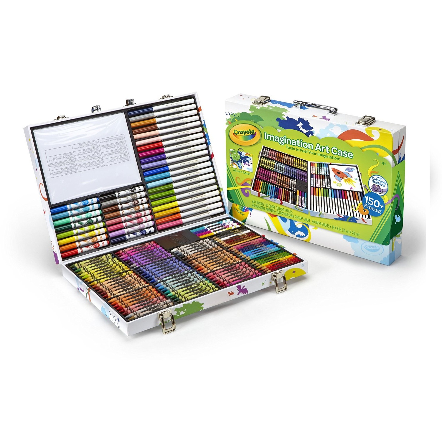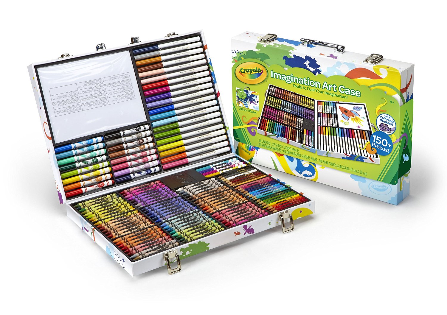 Có thể nói Crayola Imagination Art Case là một studio nghệ thuật di động, cho bé sáng tạo ở bất cứ nơi đâu và bất cứ lúc nào! Crayola Imagination Art Case được thiết kế như một chiếc vali chứa bên trong tới 150 cây bút màu với đầy đủ các dạng và theo các tông màu chuẩn: Bút sáp, bút chì màu, bột màu dạng kem, bút dạ màu…không chỉ có thế, bộ màu vẽ này còn mang tới cho bé gọt bút, bút đánh dấu, chổi vẽ, kéo an toàn và 25 tờ giấy vẽ. Tất cả các dụng cụ đều được sắp xếp một cách ngăn nắp, khoa học, giúp bé có thể tìm và sử dụng dễ dàng.