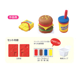 Bộ sản phẩm bao gồm tất cả những công cụ đầy đủ và cần thiết để hỗ trợ bé một cách tốt nhất trong quá trình nặn và làm những cục tẩy như: 1 sách hướng dẫn bằng tiếng Nhật và hình vẽ, thêm nữa có kèm các mảnh ghép cắt ra để làm nhãn bao ngoài ly nước và túi giấy đựng khoai tây chiên, 01 hộp nặn bao gồm 4 viên với 4 màu: Nâu, xanh da trời, vàng; 01 hộp giấy với chất liệu đặc biệt có thể đựng nước, 01 khay với 2 mảnh ghép trong đó thiết kế khuân hình dạng các loại: tròn, vuông, ly nước…