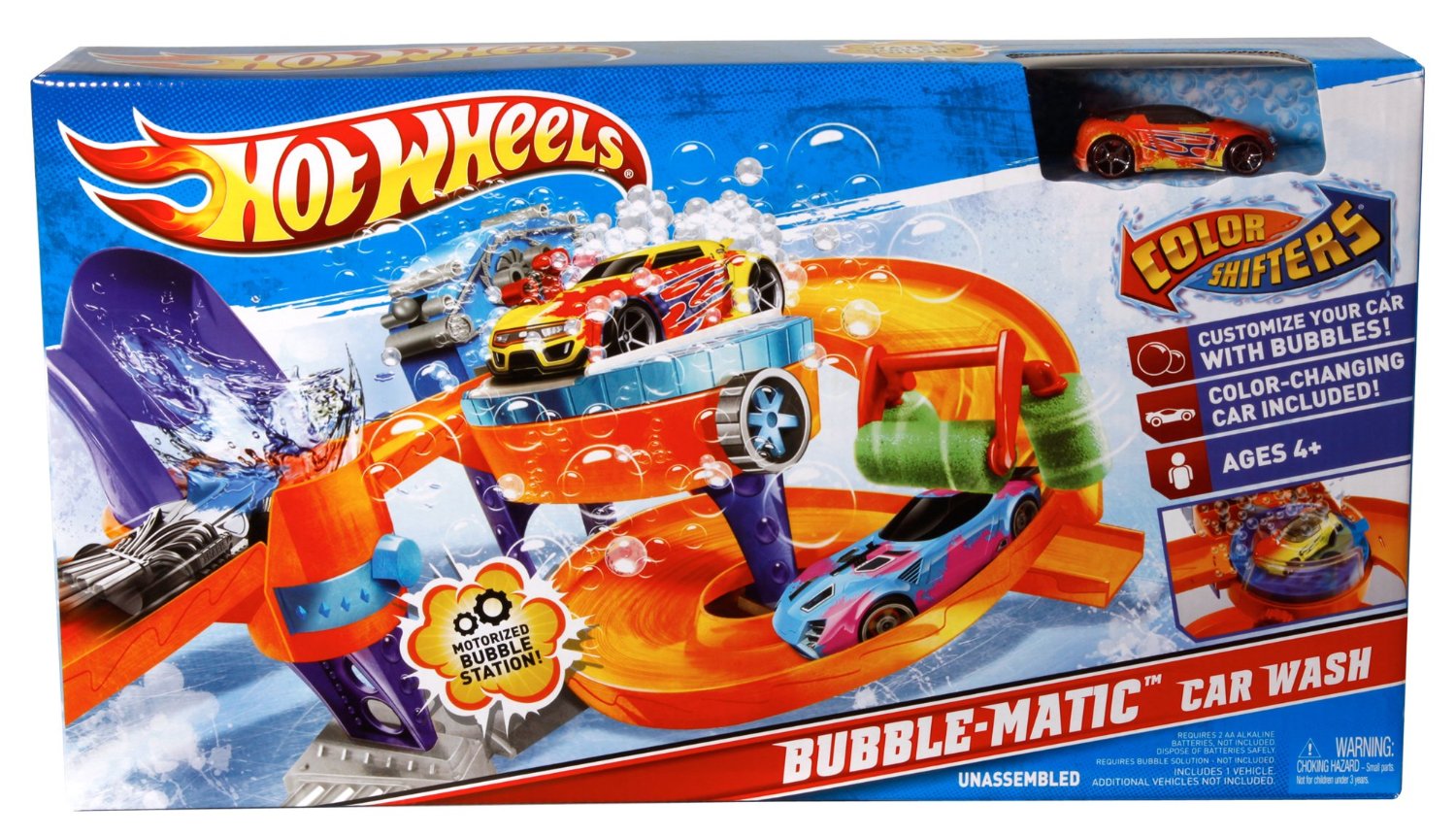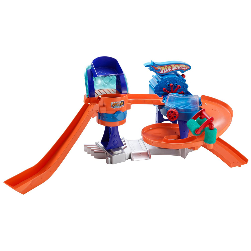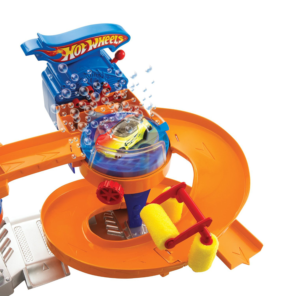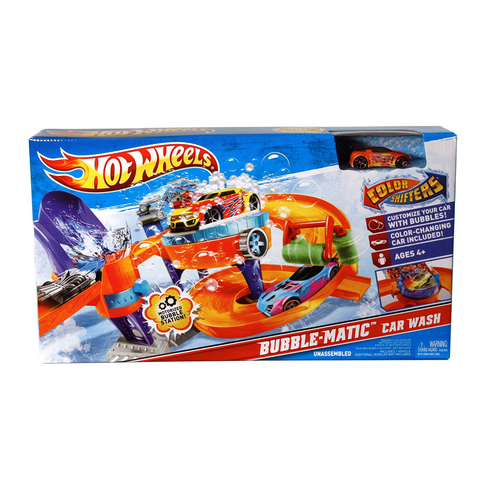 Hotwheels Color Shifters Bubble-Matic Car Wash gồm một chuỗi cung đường uốn lượn tạo ra các màn nhào lộn ấn tượng, kèm với các chặng nghỉ với thiết kế đặc biệt để giúp xe thay đổi màu sắc trên đường đi, dưới đó có các khay chứa nước ngầm để đảm bảo cung cấp nước và chống nước đổ bị bắn ra ngoài. Cung đường đầu tiên được thiết kế với trục có thể nâng lên hạ xuống, bé đặt xê vào vị trí xuất phát nâng đoạn đường lên cao, khi xe tự động lăn bánh vào chặng nghỉ thứ nhất, ở đây với trọng lượng của ô tô sẽ đẩy cần gạt xuống làm cho ô chứa nước trên đầu tự động đổ xuống mình xe, trong tích tắc chiếc xe sẽ tự động đổi sang màu khác, kì diệu như một trò ảo thuật.Sau chặng thứ nhất bé sẽ cho xe di chuyển tới chặng tiếp theo. Ở đây có một bệ xoay, giúp việc đổi chiều mặt xe vào vòi phun bọt được dễ dàng, ở trên được thiết kế một máy phun bọt bong bóng, những quả bong bóng nước này sẽ giúp xe lấy lại màu sắc như ban đầu. Chặng cuối cùng được thiết kế bông lau giúp làm khô xe trước khi về đích và bắt đầu với một hành trình lặp lại thú vị tiếp theo.