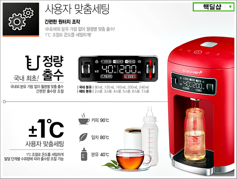 + Có thể cài đặt chính xác lượng nước chảy ra để pha sữa phù hợp cho bé: 80ml, 120ml....hoặc lượng nước cho 1 thìa bột, 2 thìa bột....