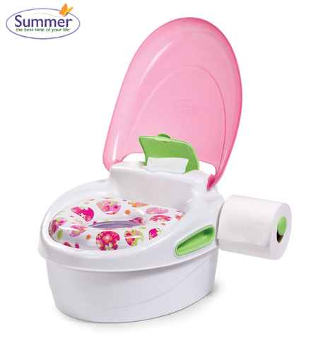 Thiết kế bô thông minh phần nắp bằng nệm êm có thể tháo rời. Bô cho bé trai có thêm miếng chắn. Chân cao su tránh trơn trượt. Có chỗ đựng giấy ướt và giấy cuộn. Đi kèm cẩm nang "Tập cho bé đi vệ sinh".