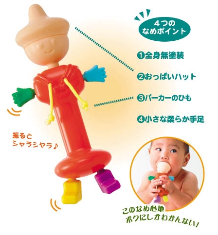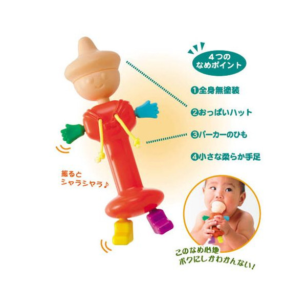 Sản phẩm có hình chú rối rất ngộ nghĩnh, có màu sắc sặc sỡ kích thích thị giác của trẻ. Phần đầu gặm nướu được làm bằng nhựa siêu mềm dẻo, chất lượng cao, độ đàn hồi tốt, chóp mũ được thiết kế giống với ti mẹ cho bé cảm giác thân thuộc. Điểm thú vị của sản phầm này chính là phần thân dài ở giữa có giây cầm nối với đôi tay, đôi chân để có thể cử động lúc lắc khi bé giật vào dây, tạo cho bé cảm giác thích thú, tò mò.