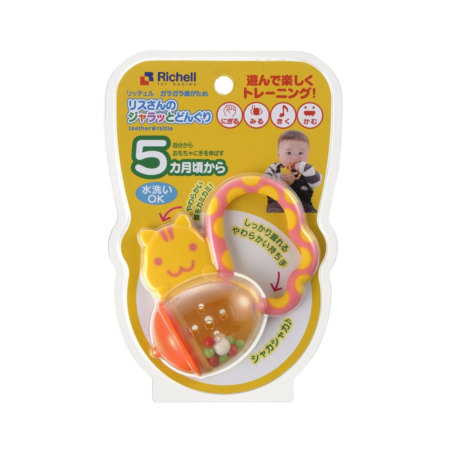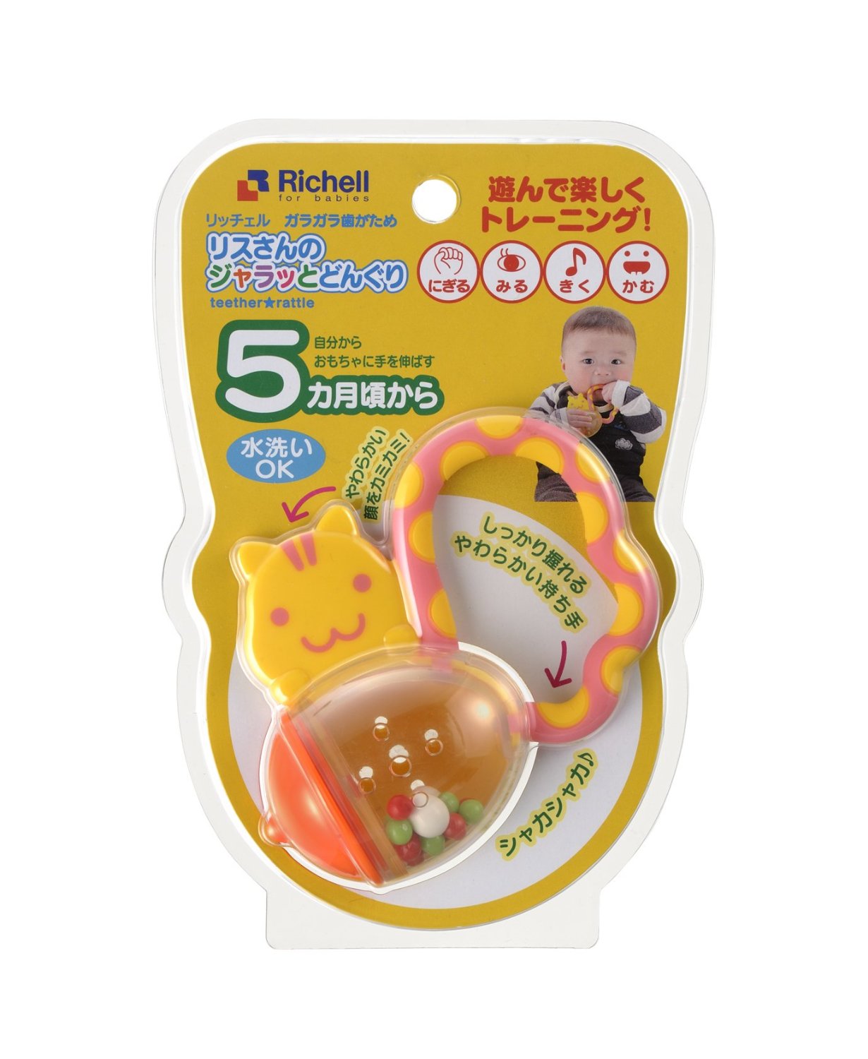 Gặm nướu xúc xắc được thiết kế dành riêng cho trẻ từ 5 tháng tuổi trở lên. Sản phẩm có màu sắc rất bắt mặt, gồm 2 phần: Phần tay cầm hình tròn được gắn liền với chú sóc vàng ngộ nghĩnh đang ôm lọ với đủ các sắc màu.