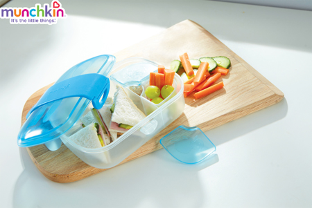 Gồm 1 hộp lớn chia 2 ngăn, 2 hộp đựng thức ăn nhỏ có thể tháo rời, 1 thìa 1 đĩa. Có thể ghi tên bé trên hộp.