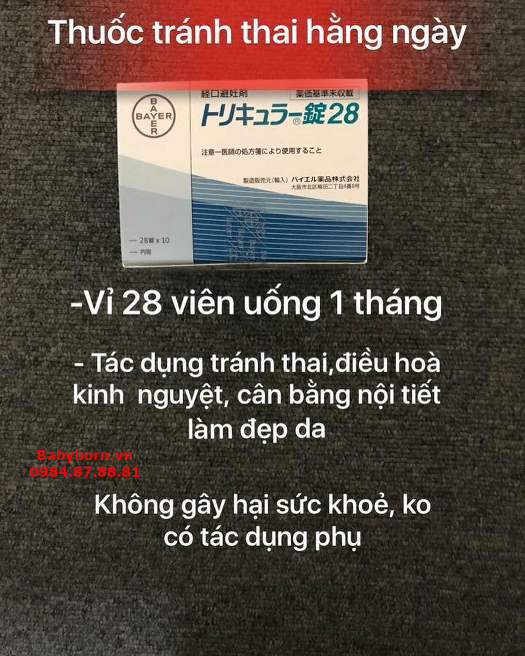 Viên thuốc tránh thai hàng ngày Nhật Bản Tricular hộp 28 viên của hãng dược phẩm nổi tiếng BAYER, một trong những loại thuốc tránh thai hàng ngày nổi tiếng là hiệu quả và an toàn được chị em Nhật bản ưa chuộng.