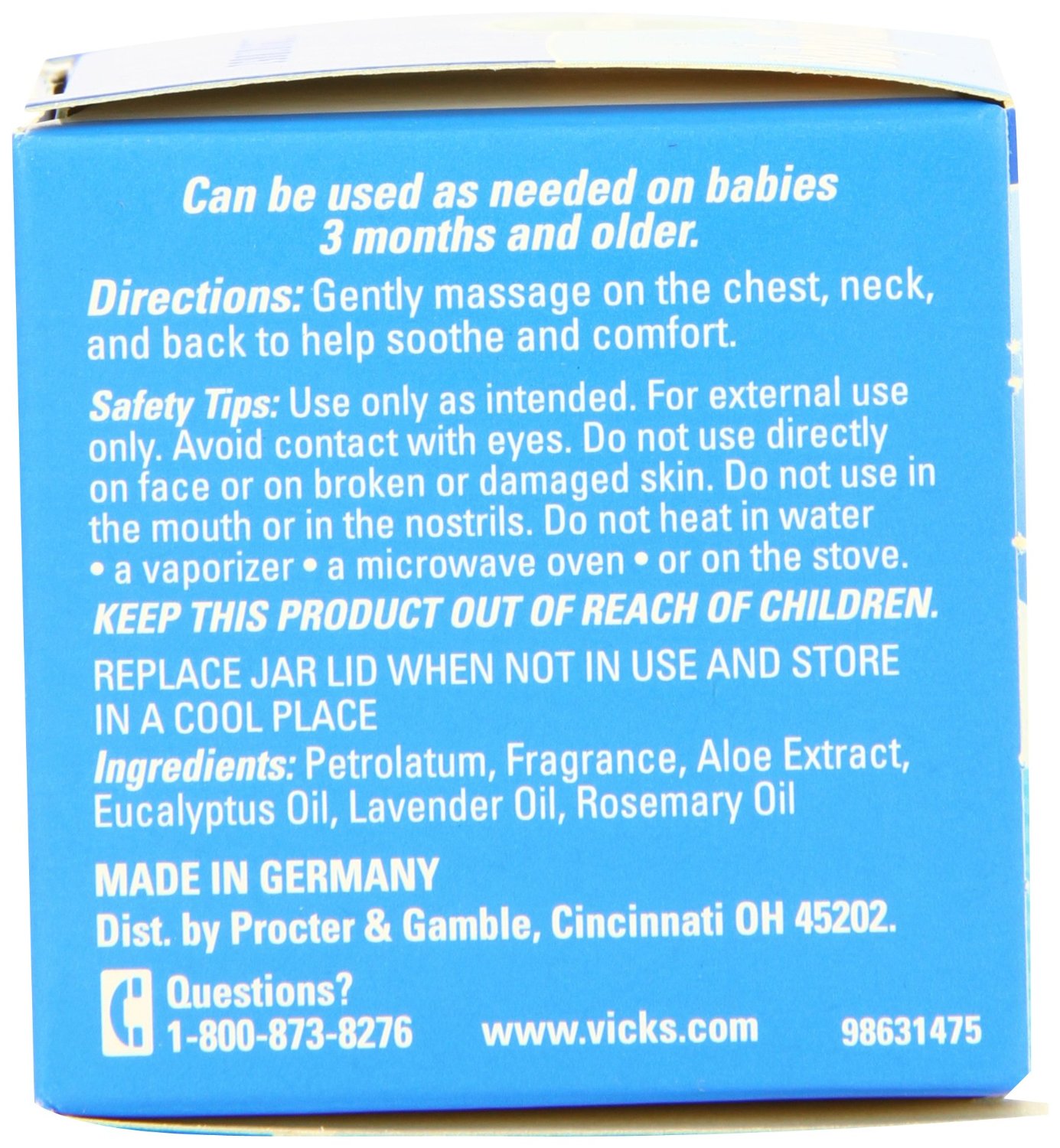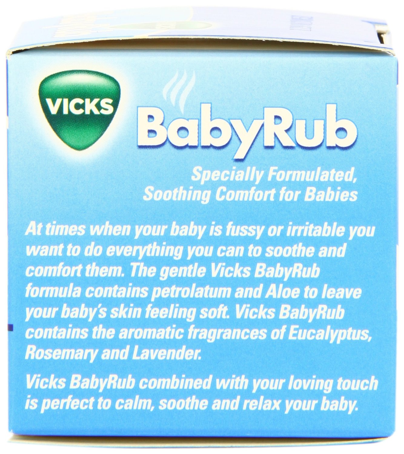 Lời khuyên của các bác sỹ nhi khoa là dùng Vicks Babyrub Soothing Ointment cho bé hàng ngày. Bạn chỉ cần thoa 1 chút dầu lên ngực và lòng bàn chân bé trước khi đi ngủ, kết hợp với sự mát xa nhẹ nhàng của bàn tay bạn sẽ giúp bé thư giãn, có được giấc ngủ ngon và giữ ấm cơ thể. Công thức Vicks BabyRub nhẹ nhàng chứa petrolatum và Aloe để lại cảm giác làn da mềm mại của bé.