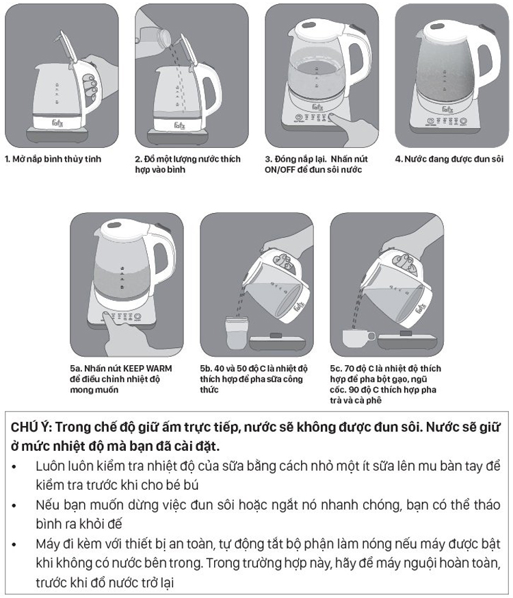 – Sau khi đặt bình vào đế và cắm điện, mẹ hãy nhấn nút “KEEP WARM” 1 lần để máy hoạt động. Nhiệt độ sẽ ở mức 90ºC và giữ ấm được trong vòng 6 tiếng.
