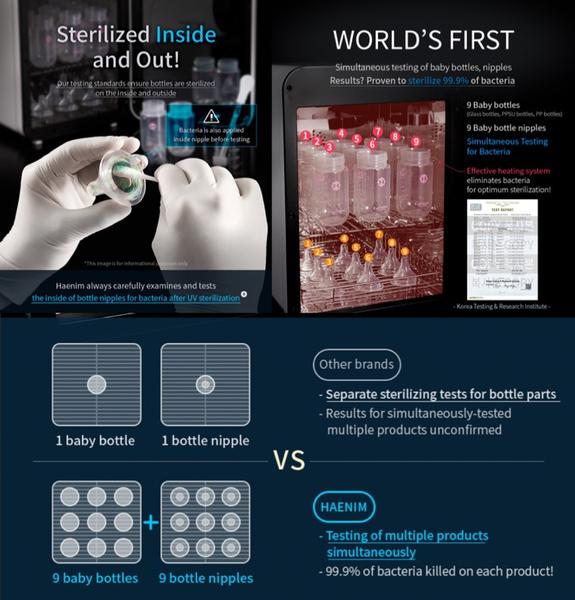 Máy tiệt trùng đa năng Haenim UV Sterilizer thế hệ thứ 3 sử dụng các tia cực tím (UV) rất mạnh để tiêu diệt tới 99,9% vi sinh vật như vi trùng, vi khuẩn và vi-rút. Vì vậy, không có nhiệt độ cao hoặc hơi nước trong quá trình này. UV khử trùng thường được sử dụng trong lĩnh vực y tế và lọc nước để đảm bảo mức độ khử trùng cao nhất.