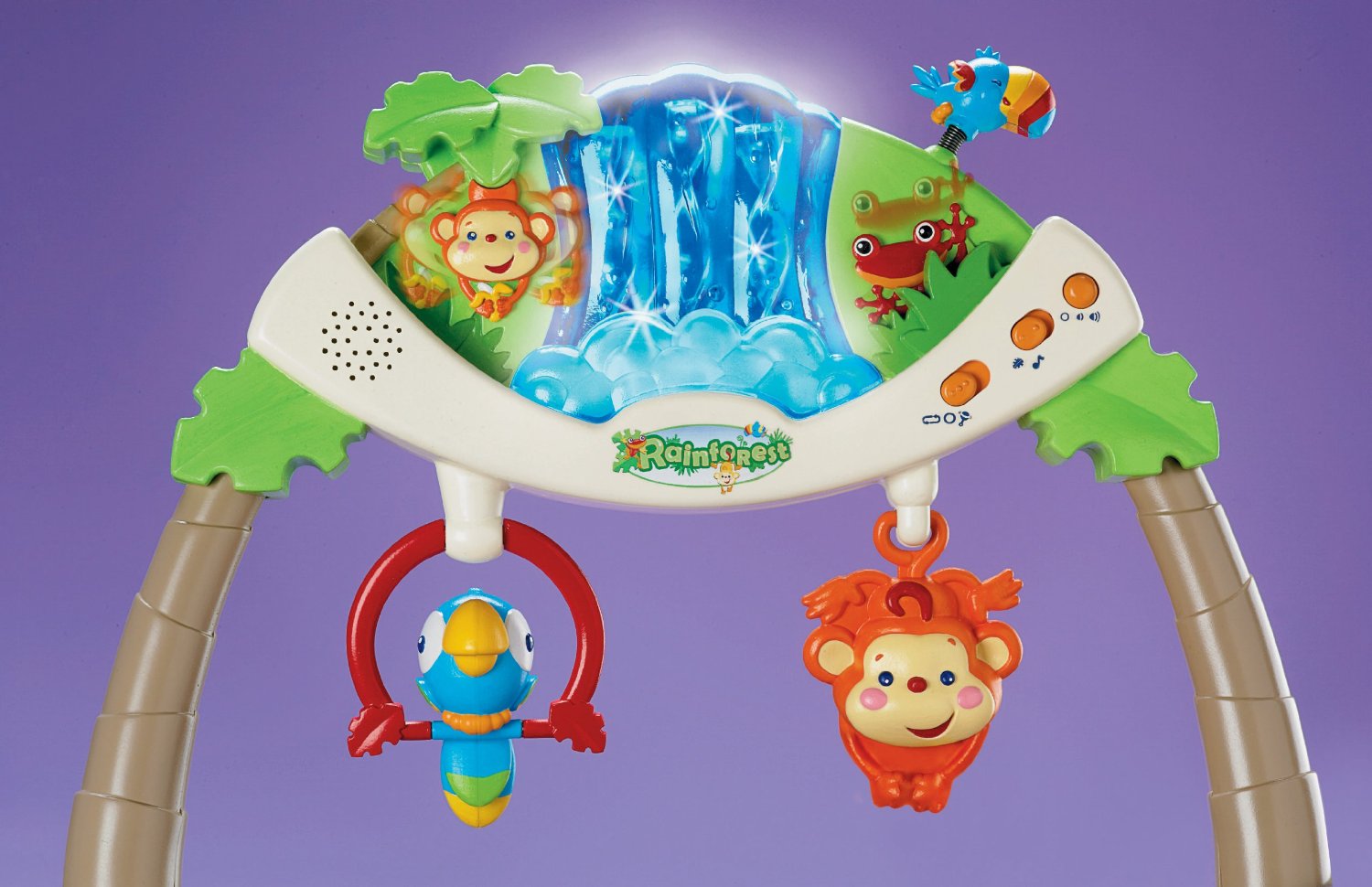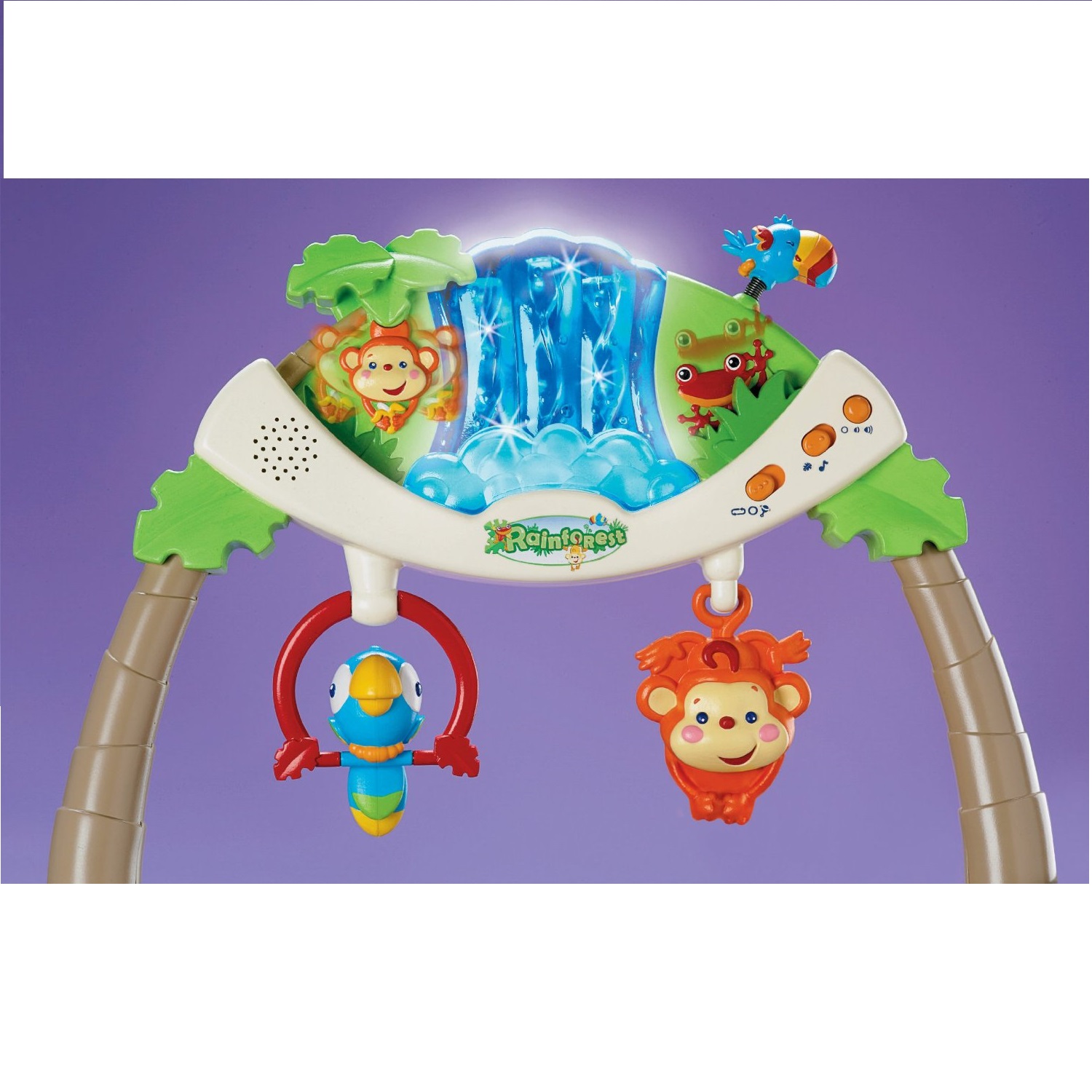 Trước mặt bé là một khung đồ chơi đầy màu sắc. Tất cả các kỳ quan của khu rừng nhiệt đới đang bị bắt cho bé của bạn trong bức tranh tuyệt vời này. Trung tâm là một thác nước chảy tạo ra bởi ánh sáng và xoắn quay rõ ràng, rừng mưa nhiệt đới ngay lập tứ sẽ thu hút và khiến bé tò mò chú ý. Hai nhân vật là chú khỉ và chim tu căng được treo ngay trước mặt bé để kích thích thị giác. Bé cũng sẽ thích xem những con ếch cây và khỉ chơi ú oà trong lá gần một thác nước lấp lánh, trong khi di chuyển Tu căng qua lại trên không. Có 6 bài hát cùng để bạn kích hoạt liên tục và 3 hiệu ứng âm thanh đi kèm khi bé chạm vào đồ vật để kích thích thị giác và thính giác cho bé, khiến bé thích thú với việc vận động chạm vào các con vật được treo. Nắm bắt động vật rừng nhiệt đới đầy màu sắc vào thúc đẩy sự phối hợp giữa mắt và tay của bé. Khi bé muốn ngủ, bạn có thể tháo thanh đồ chơi ra, sau đó bật chế độ rung và bắt đầu vào giấc ngủ ngon lành.
