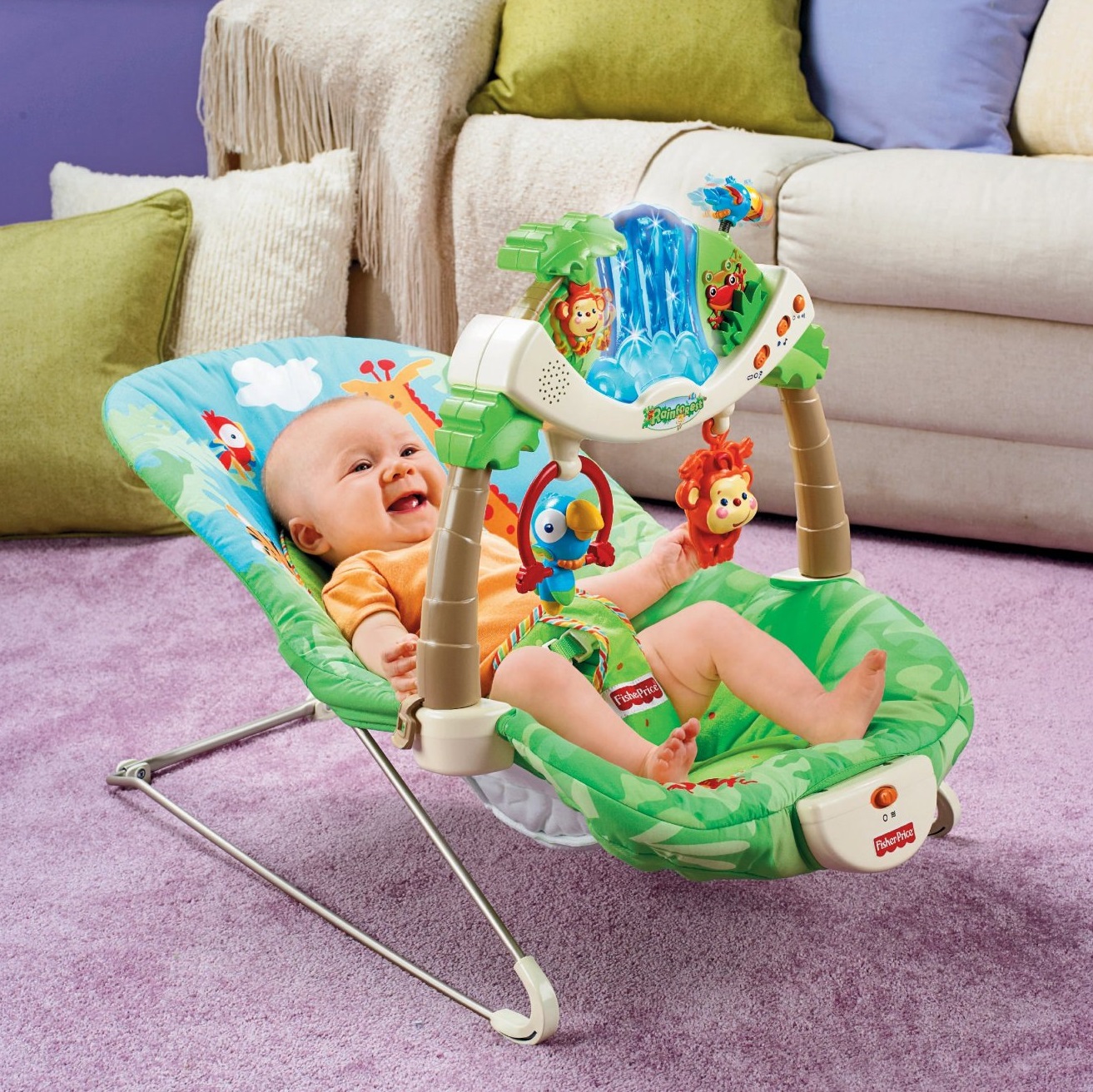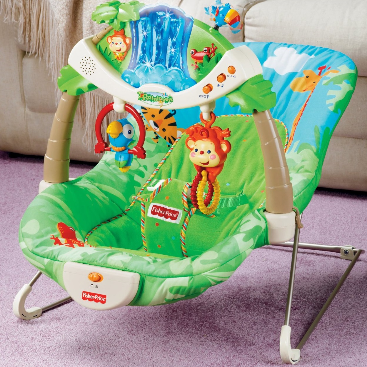 Được thiết kế để sử dụng cho trẻ sơ sinh tới khi bé có thể tự ngồi, trọng lượng tối đa là 11 kg. Với chủ đề khu rừng nhiệt đới, Fisher-Price Rainforest Bouncer sẽ tạo cho bé một cảm giác thoải mái, an lành như đang được gần gũi với thiên nhiên. Fisher-Price Rainforest Bouncer cung cấp những đồ vật để làm bé có thể tự chơi một mình, mát xa và ru bé ngủ. có một khung an toàn để đặt và giữ bé một cách dễ dàng nhưng vẫn tạo cảm giác thoải mái cho bé. Ghế được bọc bằng loại vải cao cấp rất êm. Dưới mặt ghế có gắn một máy rung khiến chiếc ghế có thể đung đưa êm ả, nhẹ nhàng tạo cho bé cảm giác như đang được vỗ về, chăm sóc.