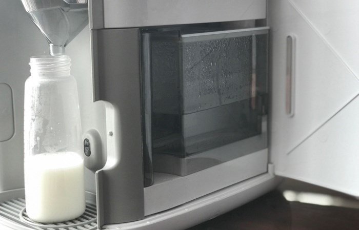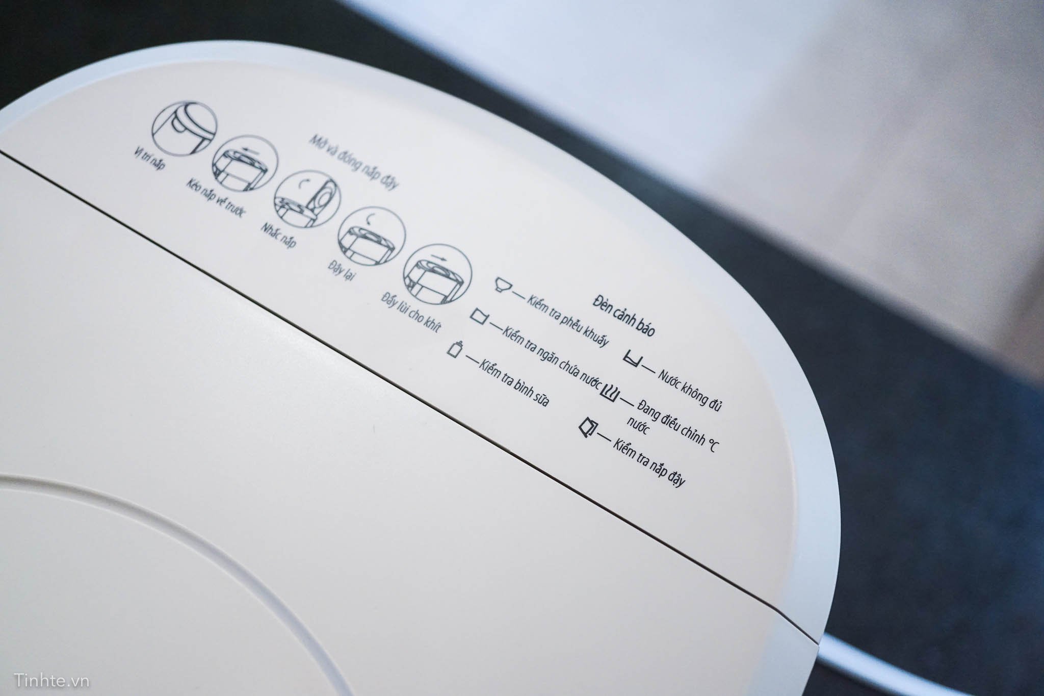 + Để đảm bảo vệ sinh thì vài ngày nên tháo nước làm nguội và nước hâm đổ đi, thay nước khác. Bên phía phải là hộc đựng nước để pha sữa, phía trên hộc đựng nước là bộ phận khử trùng nước bằng tia cực tím. Phễu pha sữa nên được vệ sinh mỗi ngày luôn cho an toàn.