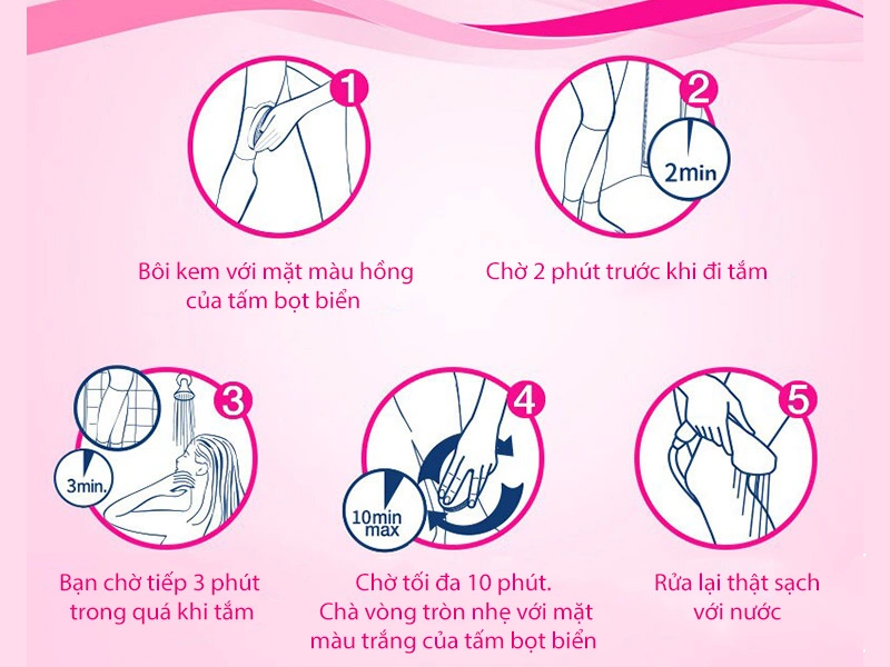 Lưu ý: Nếu lông bạn hơi khó tẩy, bạn có thể để thêm 5 phút, nhưng không được để quá 10 phút nha. Nếu da của bạn quá mẫn cảm, bạn có thể sử dụng phần mặt hồng của tấm bọt biển để tẩy lông.