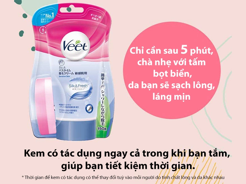 • Kem tẩy lông Veet có tác dụng tẩy lông rất nhanh. Chỉ cần thoa kem, chờ 5 phút rồi rửa sạch lại sử dụng bọt biển đi kèm là bạn đã có một vùng da láng mịn, sạch lông.