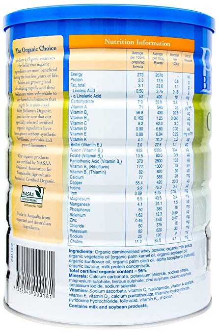 Các sản phẩm Sữa Bellamy's Organic Follow-on Formula hữu cơ của được chứng nhận bởi NASAA (Hiệp hội quốc gia về nông nghiệp bền vững Úc) được chứng nhận hữu cơ.