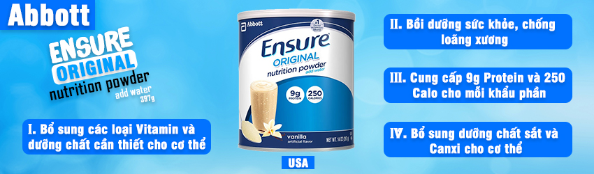 - Sữa Ensure Original Hương Vani 397g Nội Địa Mỹ có chứa đến 60% Canxi, vitamin D. Đó là canxi dễ hấp thụ, tăng cường hệ xương vững chắc, ngăn ngừa tình trạng loãng xương.
