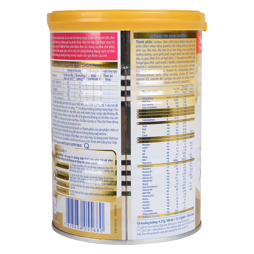 - Sữa Nan Supreme số 1 400g dành cho trẻ từ 0-6 tháng tuổi chứa công thức mới cải tiến Nestlé HM-O là Oligosaccharides 2'FL đã được nhiều nghiên cứu khoa học cho thấy giúp tăng cường sức đề kháng cho trẻ.
