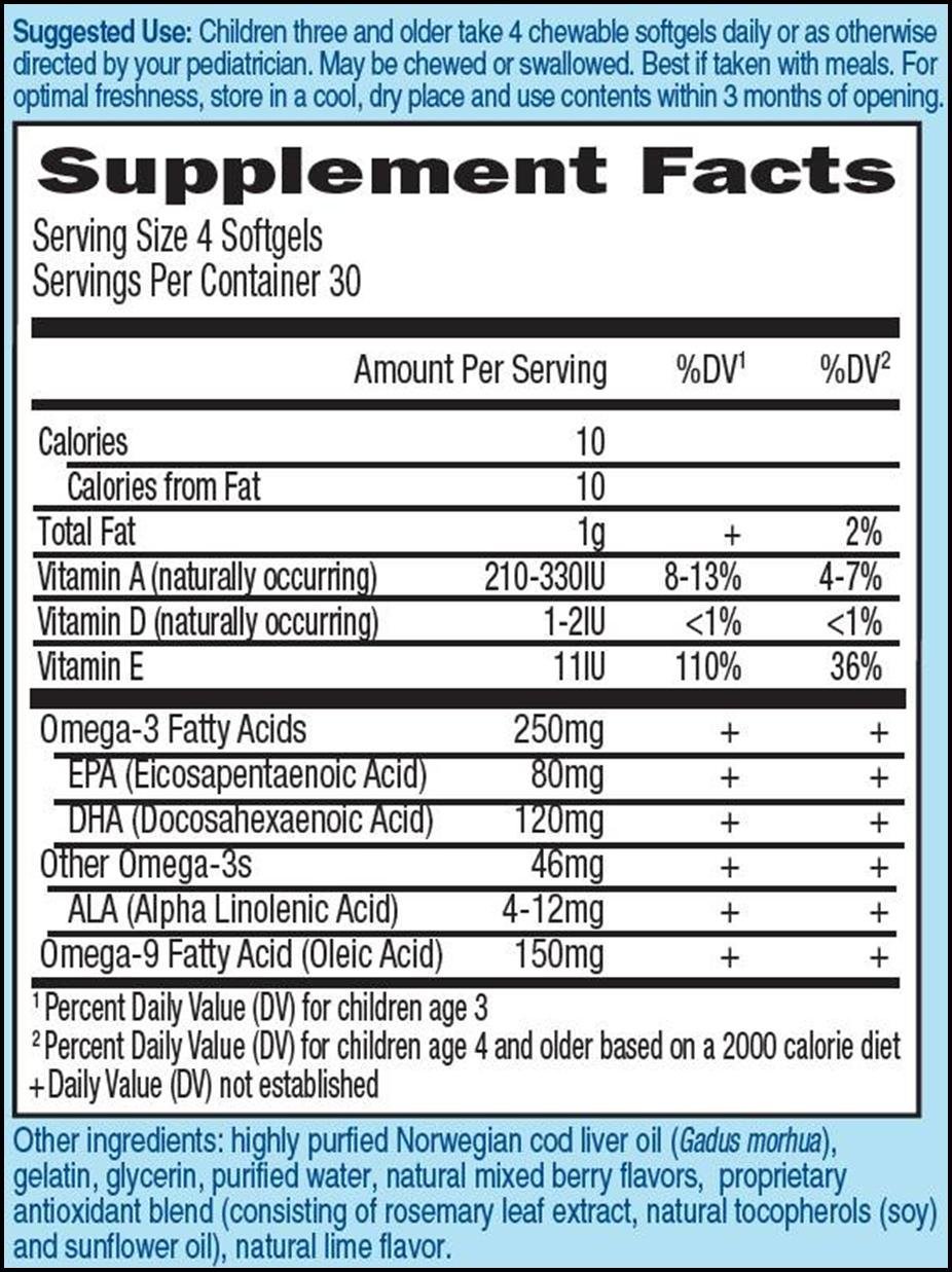 Kids DHA Chewables được tinh chế cẩn thận qua nhiều giai đoạn, quá trình chưng cất phân tử đảm bảo loại bỏ các độc tố từ môi trường bên ngoài, với hương vị berry dễ chịu, hàm lượng 250mg tổng các axit béo Omega-3 và DHA trong mỗi viên đáp ứng khẩu phần dưỡng chất hàng ngày cho các bé. Sản phẩm khuyến khích khuyên dùng cho trẻ em từ 3 tuổi trở lên.