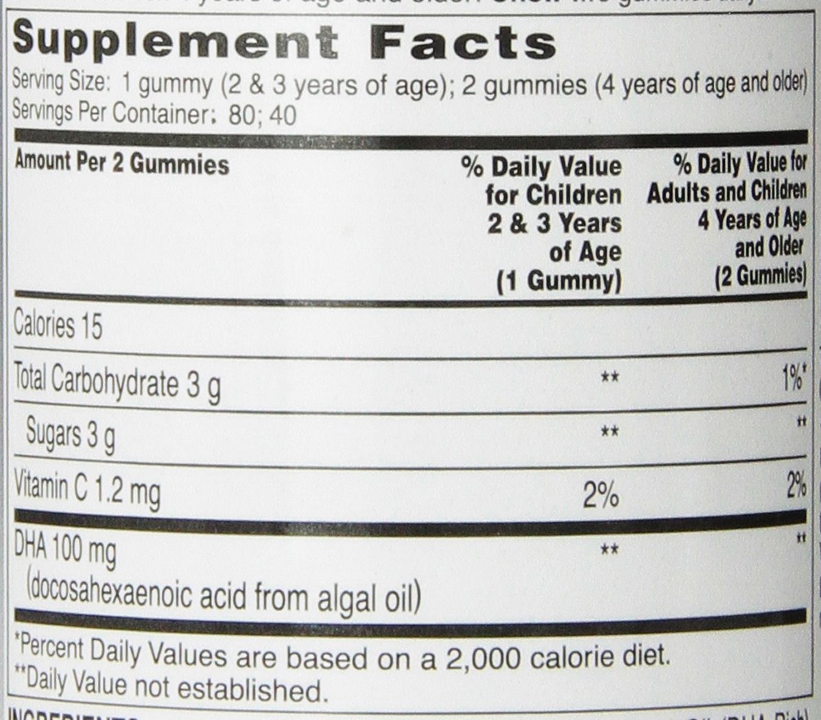 Đường từ trái cây tự nhiên, Gelatin, omega 3 DHA, nước, hương liệu tự nhiên; ít hơn 2%: Acid Ascorbic, sáp ong, Wax carnauba, dầu thực vật (dầu dừa, dầu cọ)