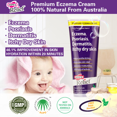 Kem Hope’s Relief Premium Eczema là sản phẩm đặc trị cho các triệu chứng chàm, vảy nến (psoriasis) viêm da (dermatitis ), da khô ngứa (itchy dry skin), kem Hope’s Relief Premium Eczema Cream không chứa cortisone và có 300mg/g các thành phần tự nhiên tích cực để nhằm: