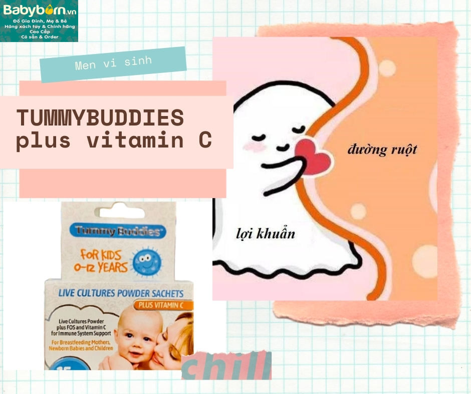 - Men vi sinh Tummy Buddies Plus Vitamin C độc đáo này đã được pha chế đặc biệt cẩn thận để hỗ trợ sự cân bằng lành mạnh của hệ vi khuẩn đường ruột (hệ vi sinh vật đường tiêu hóa) cho hệ tiêu hóa nhạy cảm của trẻ nhỏ và trẻ nhỏ.