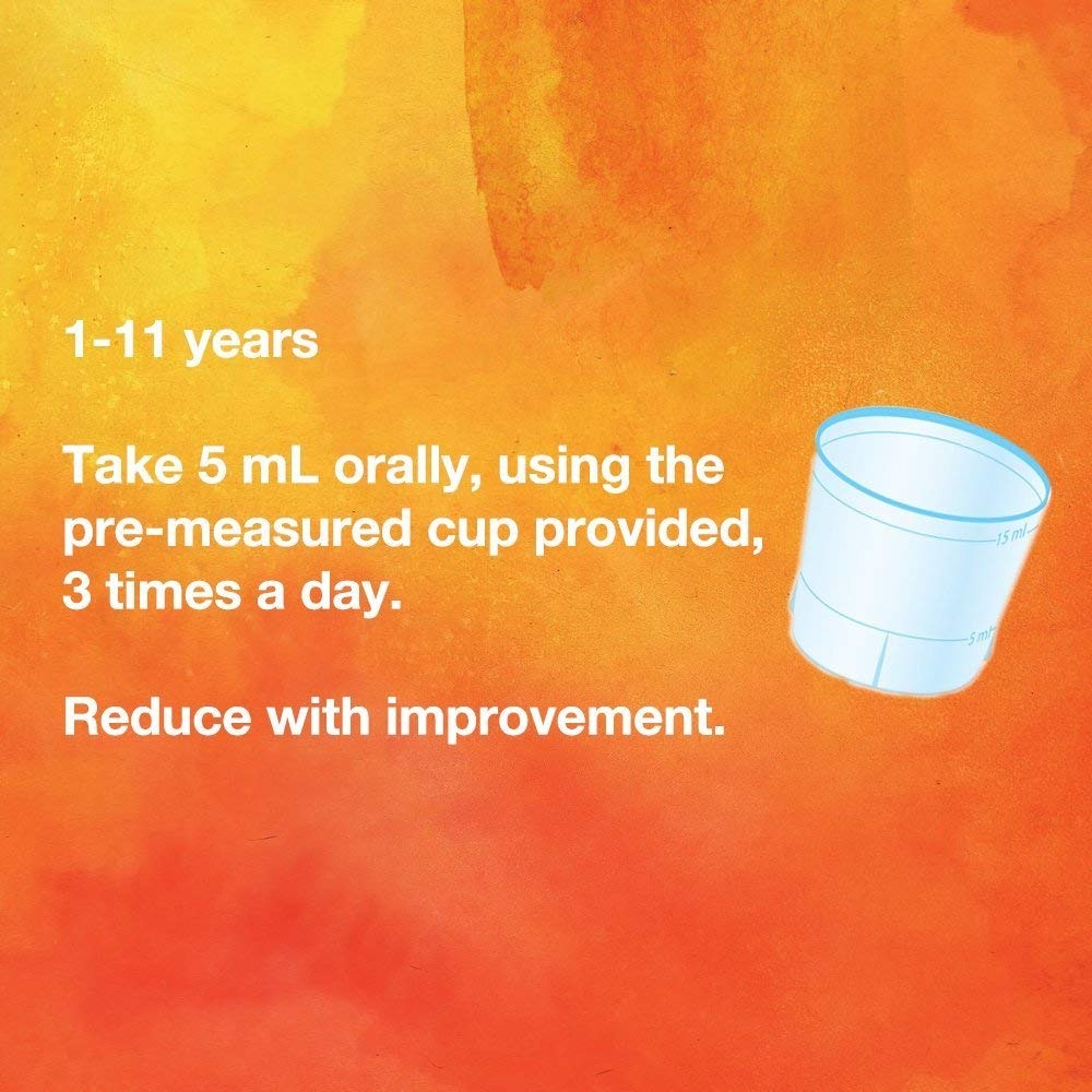 Uống 5 ml bằng miệng, sử dụng cốc đo trước được cung cấp, 3 lần mỗi ngày. Không dùng cho trẻ em cân nặng dưới 8 kg
