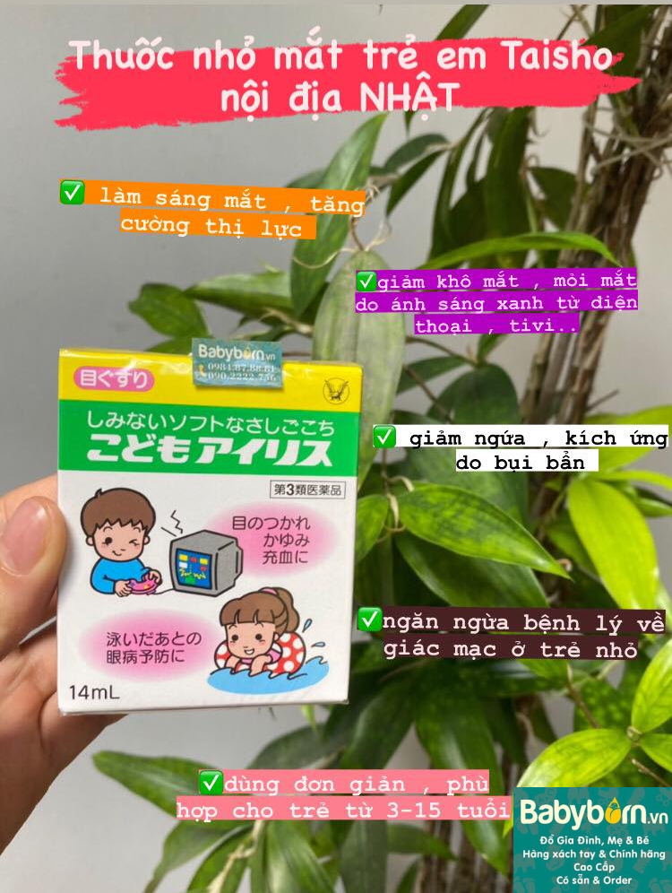 Shop Babyborn xin giới thiệu với các mẹ một sản phẩm mới : thuốc nhỏ mắt trẻ em Taisho 14ml nội địa Nhật không chỉ giúp cung cấp độ ẩm, giảm khô mắt, làm dịu đôi mắt mà còn kháng viêm, kháng khuẩn, ngăn chặn các tác nhân gây hại từ bên ngoài môi trường, ánh sáng xanh, UV, khói bụi,…
