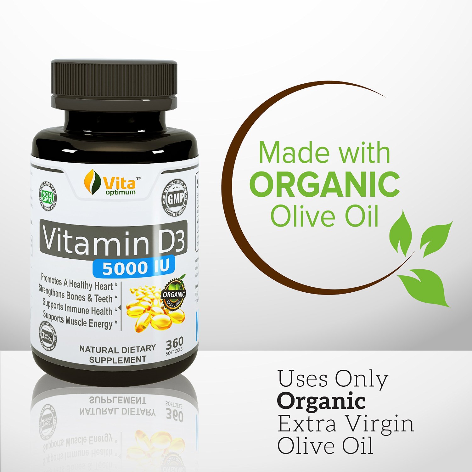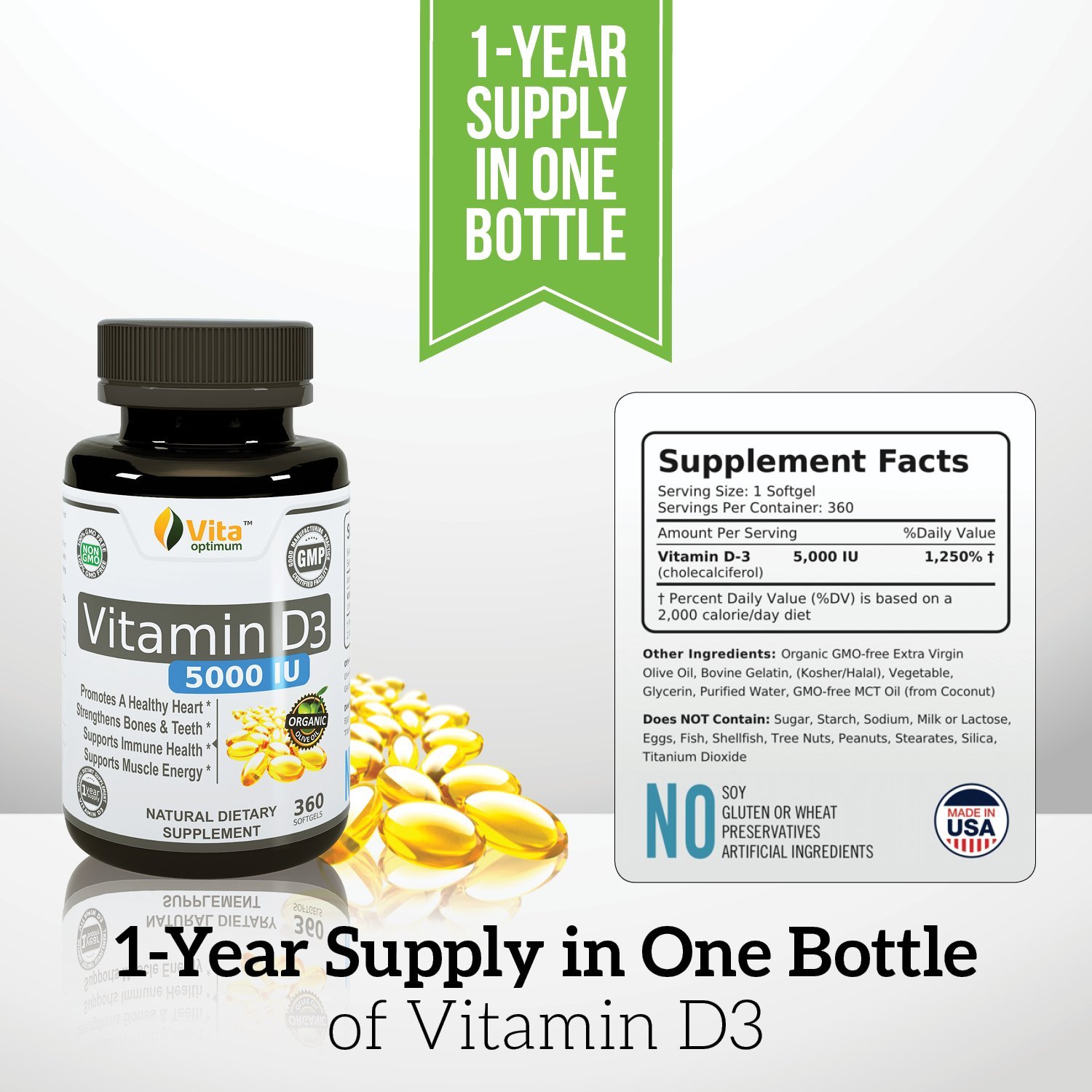 Thành phần chính: Vitamin D3 5000 IU, ngoài ra có chứa dầu đậu nành, dầu bắp, gelatin, glycerin thực vật, mỗi ngày một viên sử dụng trong bữa ăn, giúp bạn hoàn toàn yên tâm vì đã được cung cấp đủ dưỡng chất giúp củng cố độ chắc khỏe của xương, ngăn ngừa bệnh viêm khớp, mỏng xương và phòng tránh một số bệnh ung thư khác do thiếu hụt sự trao đổi tế bào bởi thiếu vitamin.
