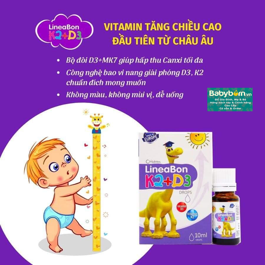 Tuy nhiên vitamin D lại có rất thấp trong các thực phẩm tự nhiên và ngay cả trong sữa mẹ nên không đủ nhu cầu cơ thể. Việc phơi nắng thường xuyên để hấp thụ vitamin D cũng không phải dễ dàng, nhất là vào mùa đông, hoặc trẻ còn quá nhỏ. Vì vậy LineaBon K2+D3 bổ sung lượng vitamin D3 cần thiết mỗi và hợp lý cho bé mỗi ngày.